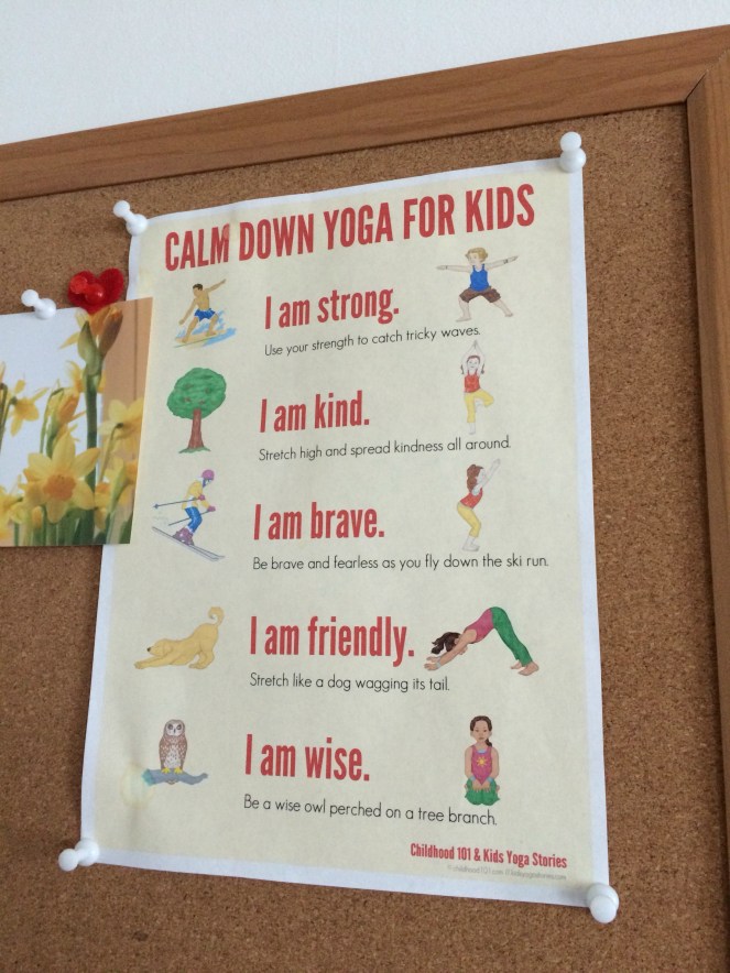 I hung this in our playroom weeks ago and went over it with J. For a while it went dormant. I would mention it as an option for calming down (something we’ve been having to do A LOT of lately), but it wasn’t getting much love. Then, out of the blue, in the middle of a crying snot fit, J asked if he could do a yoga pose. YES, YES YOU CAN.