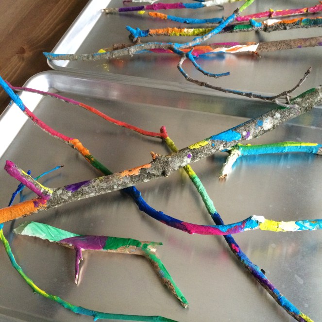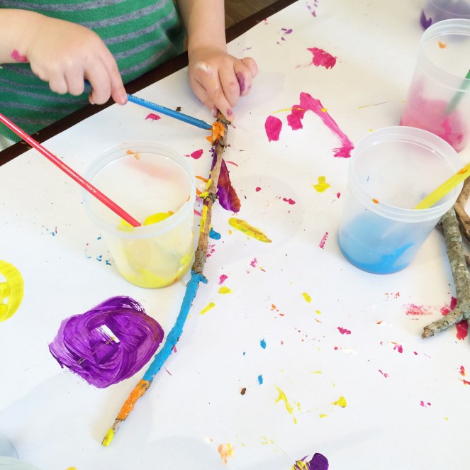 Once we had our sticks, the next step was paint. I used a sheet of paper to cover the table, which ended up itself being an unexpected piece of art.