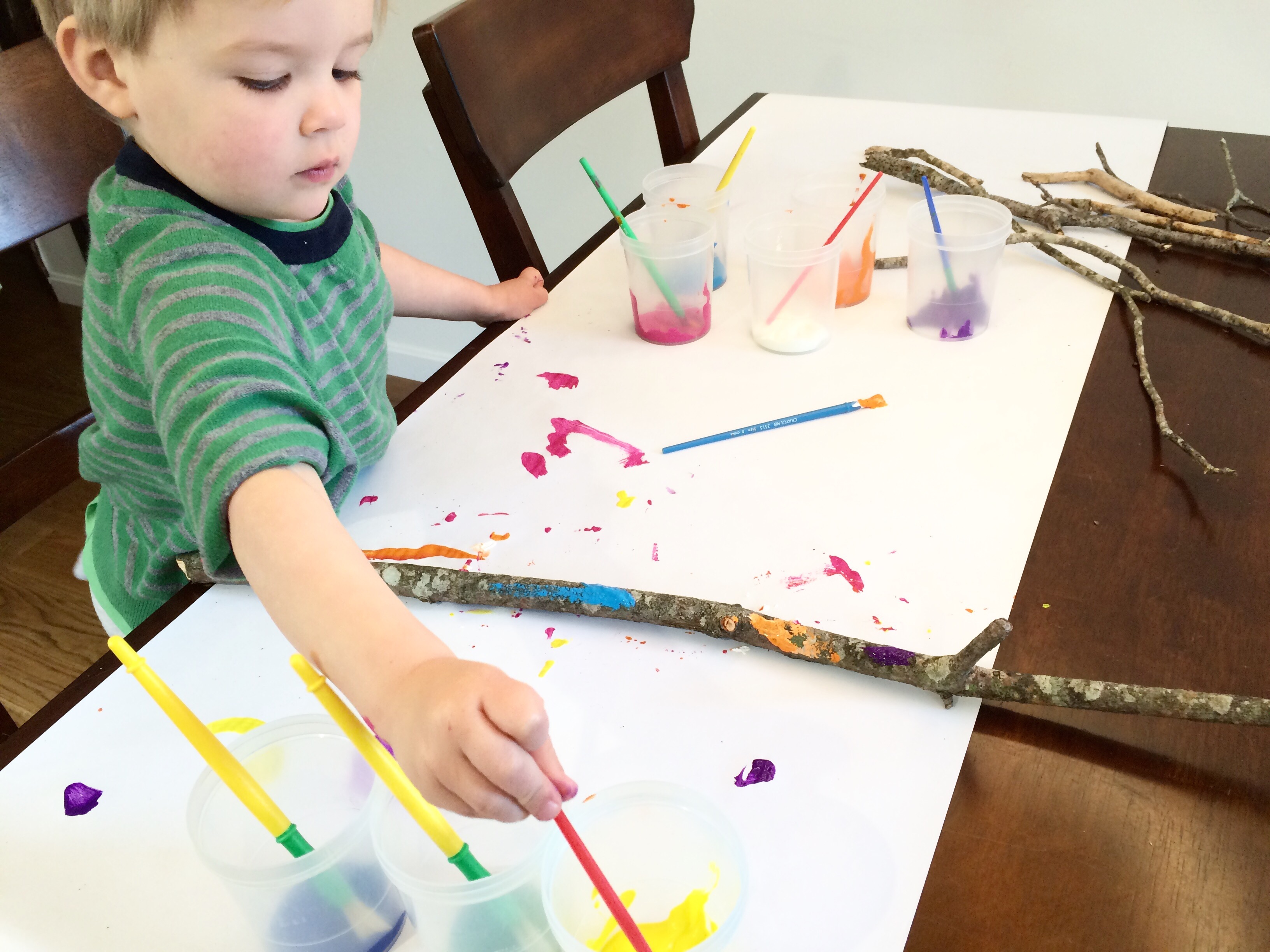 Once we had our sticks, the next step was paint. I used a sheet of paper to cover the table, which ended up itself being an unexpected piece of art.
