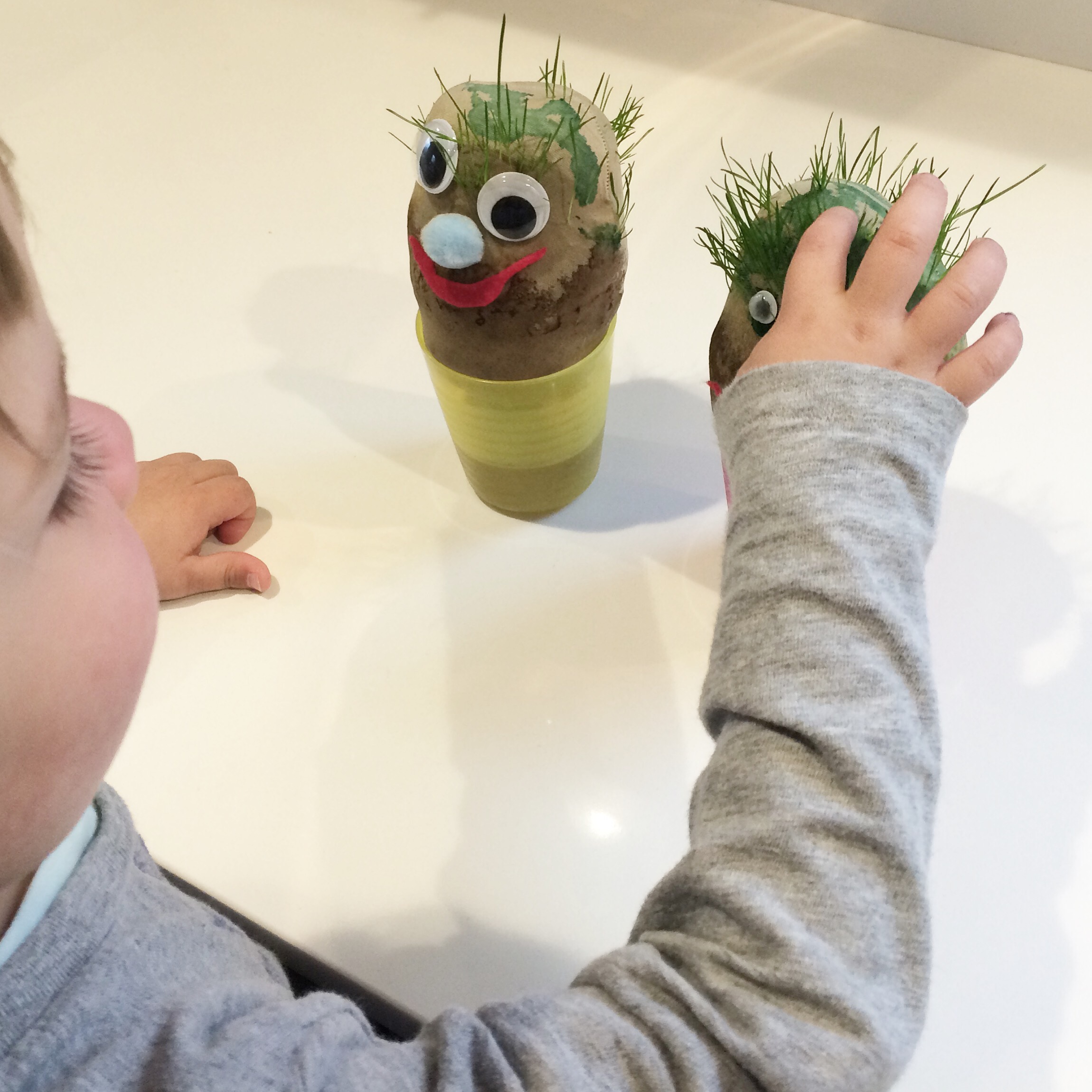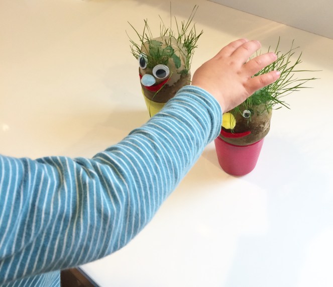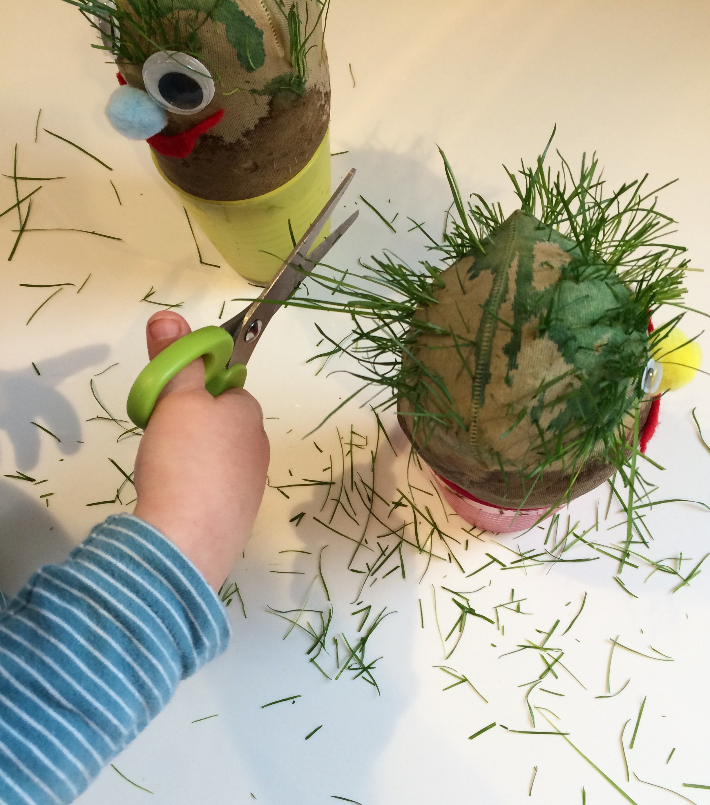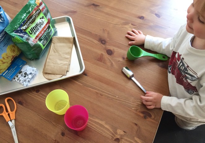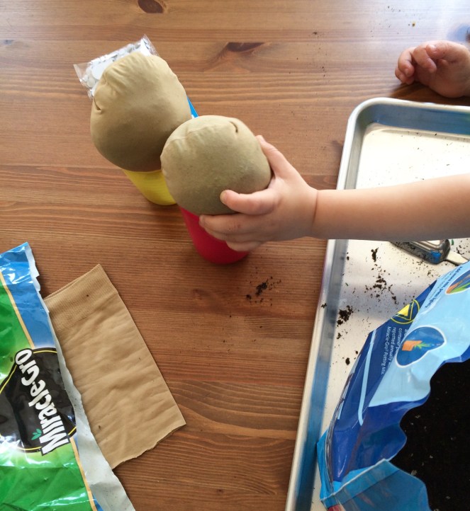 I don’t have too many pictures from making these babies, because we had our hands deep in soil and it was a two-person project! We didn’t measure (I’m turning into my mama cooking), but we probably used a few tablespoons of grass seed and two cups of soil, enough to make a sizable ball. I held the tights open while Jackson scooped, first the seed, then the soil. I knotted the fabric, then plopped it in a cup with some water. The fabric hanging down in the cup wicks the water up into the soil.