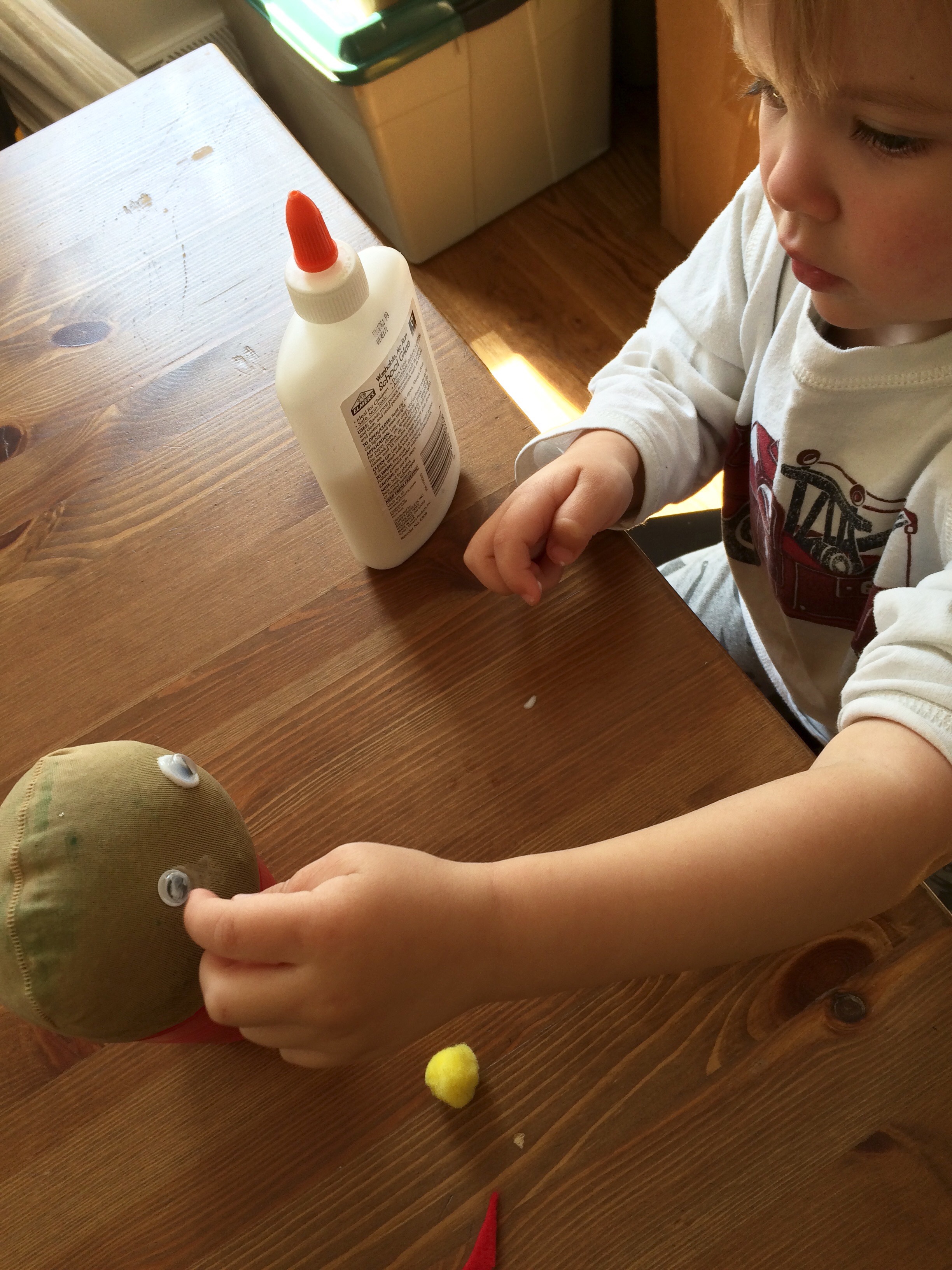 Once we had our heads formed, we added faces. We used googly eyes, pom pom noses, and felt mouths, but you could use anything. Jackson recently asked if we could add shoes! You could use a hot glue gun or Elmer’s to attach the faces.