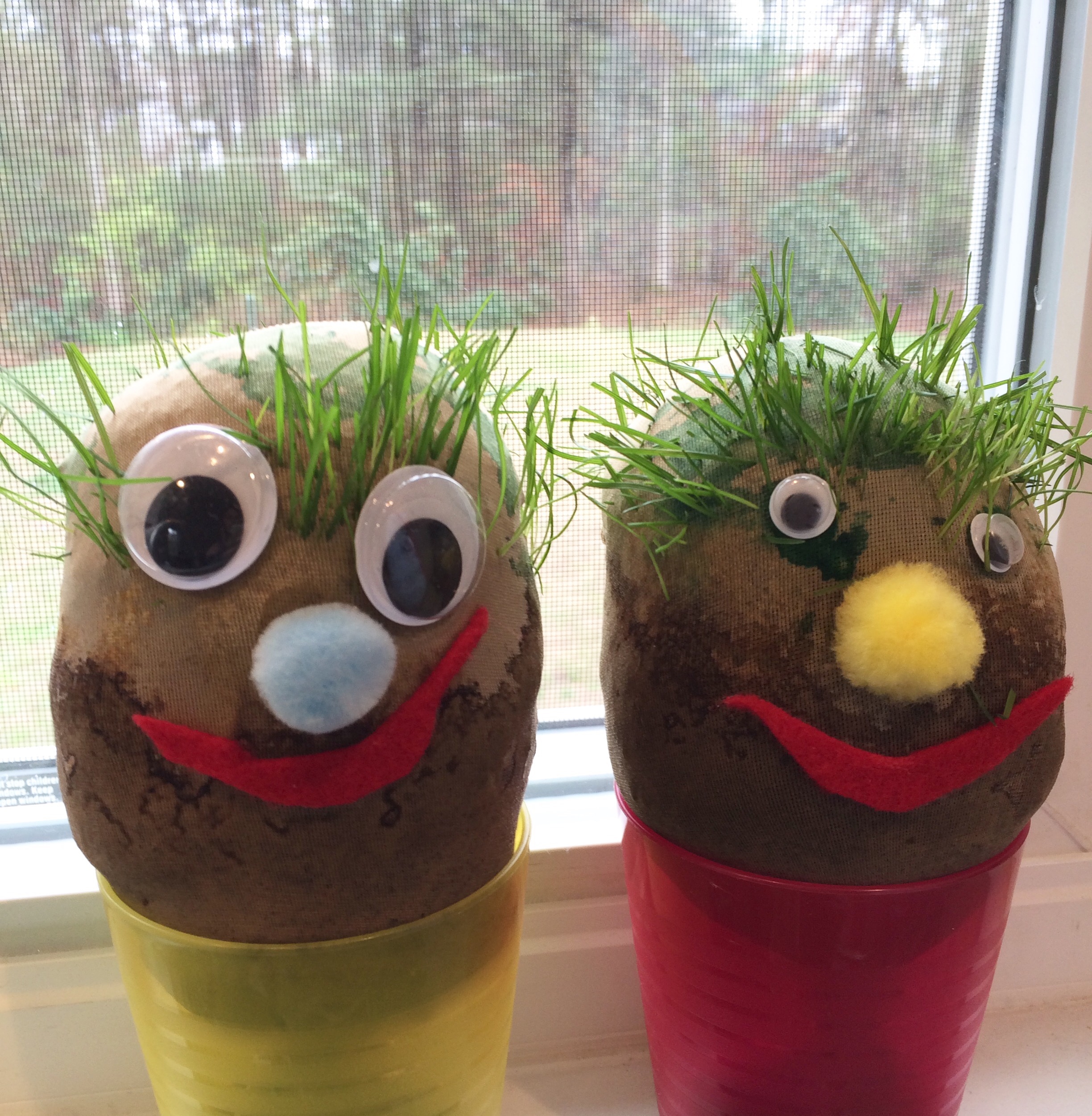 Materials you’ll need: potting soil, grass seed, a pair of nylon tights or socks, a scoop, cups or small pots, decorations for the face, and glue.