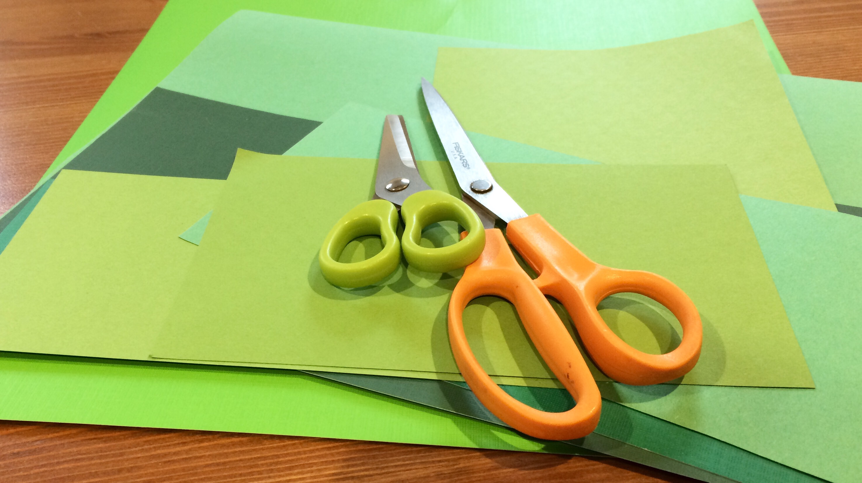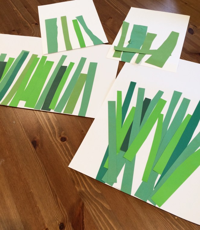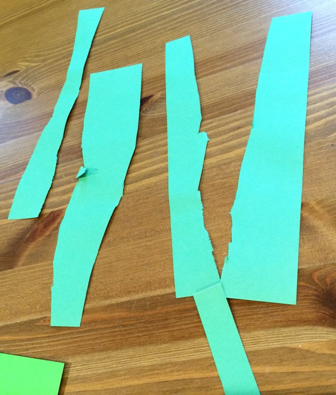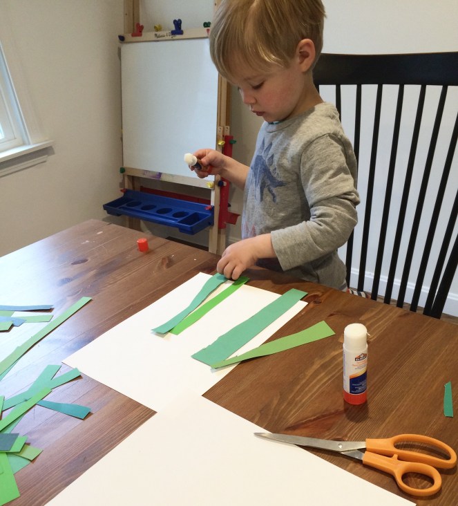 We started out with the stems. You could make these in a ton of different ways, including paint, finger paint, torn paper, pipe cleaners, or tissue paper. We’re big on scissor practice right now, so we cut ours out of a bunch of green paper scraps.