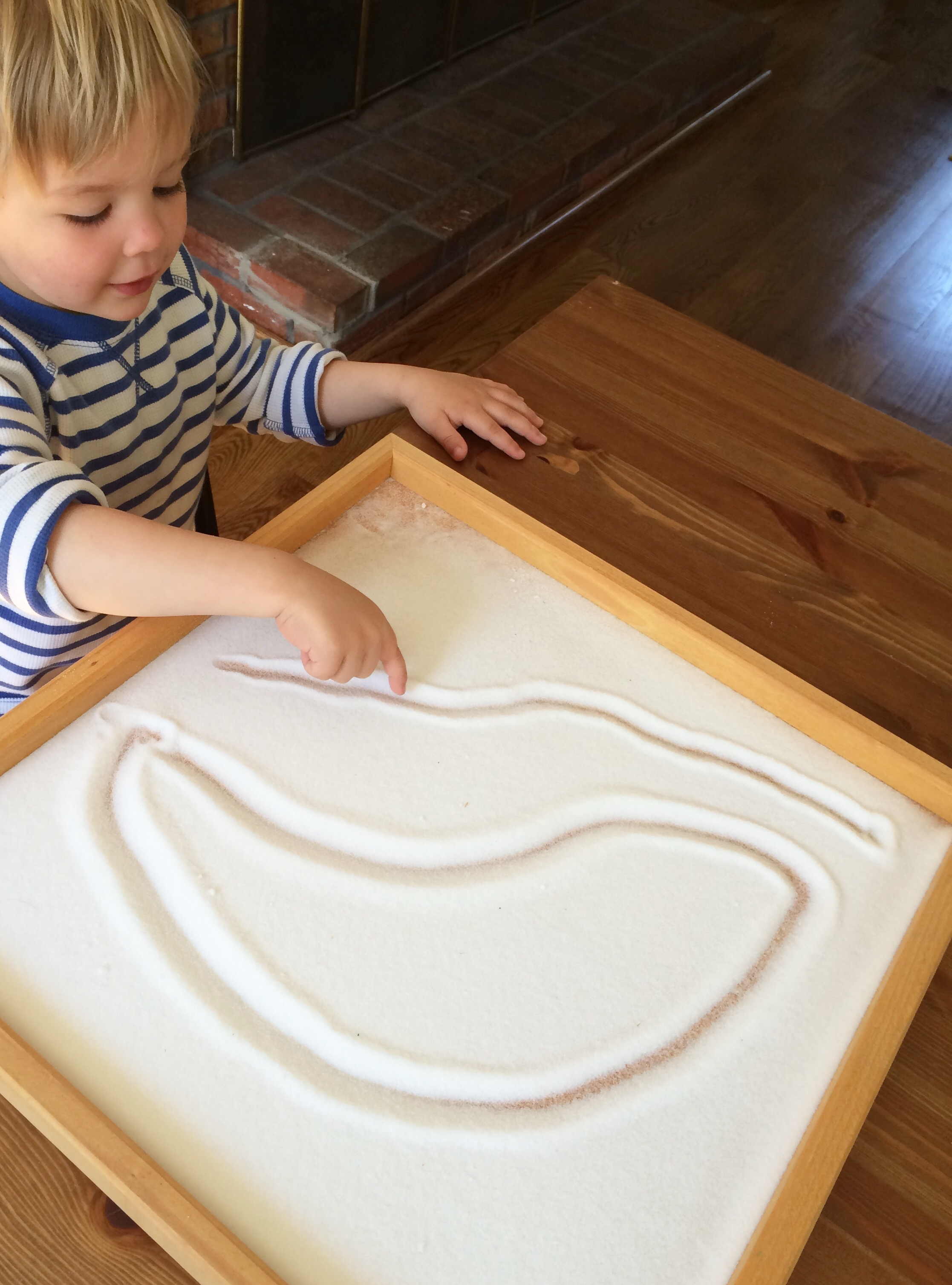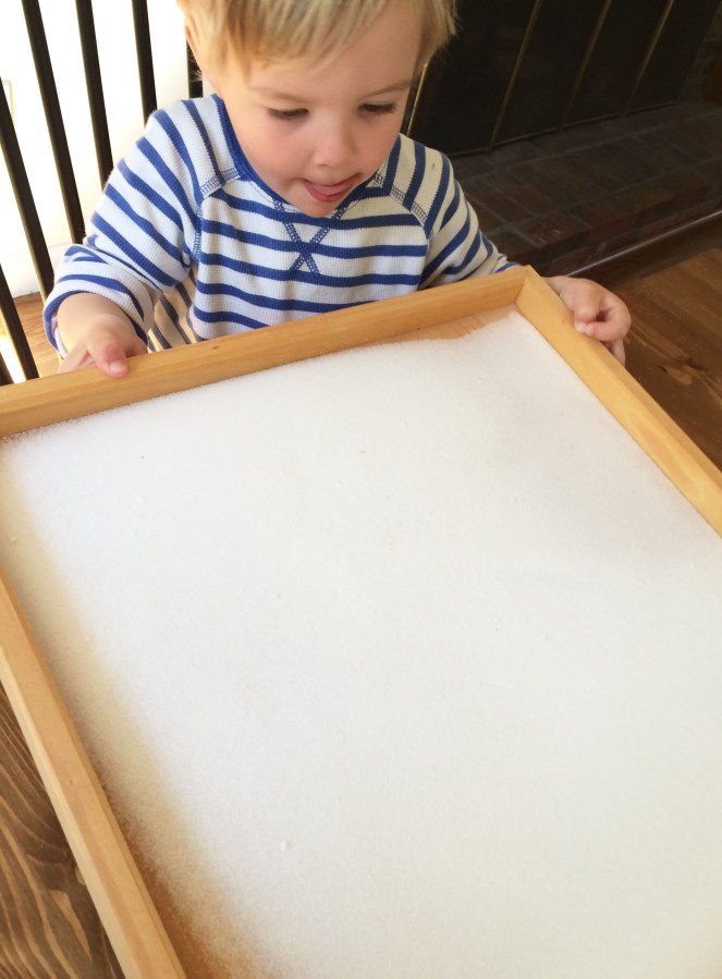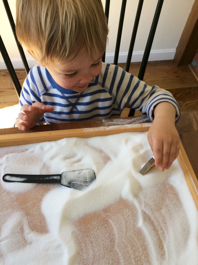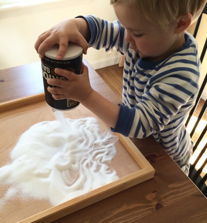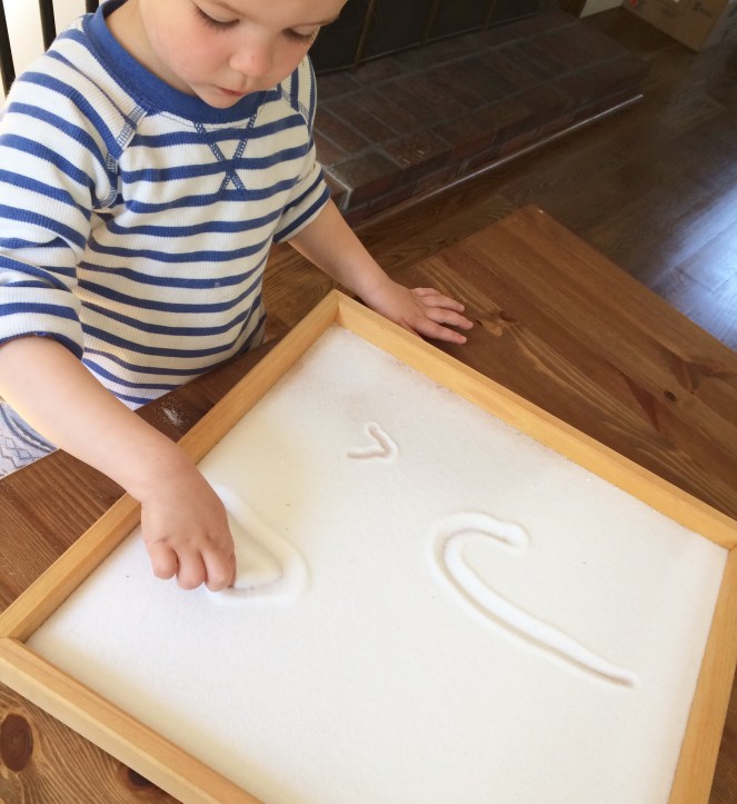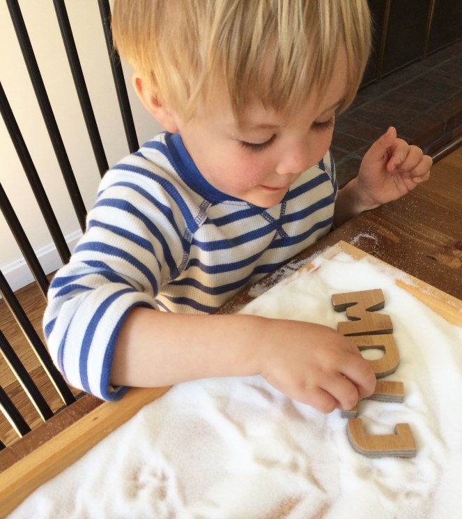 Pour salt into a tray (or baking sheet… anything with sides) and you’re off! We started with letters. Jackson LOVES spelling his name. Then Lucas’s name. Then Mama. (I’m trying so hard to hold onto this. I’m not ready for m-o-m.)