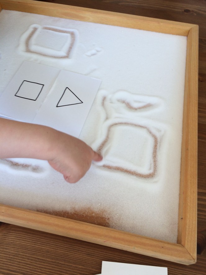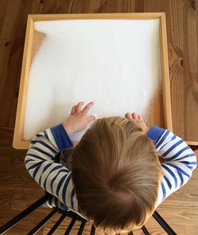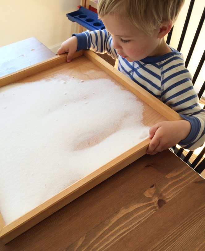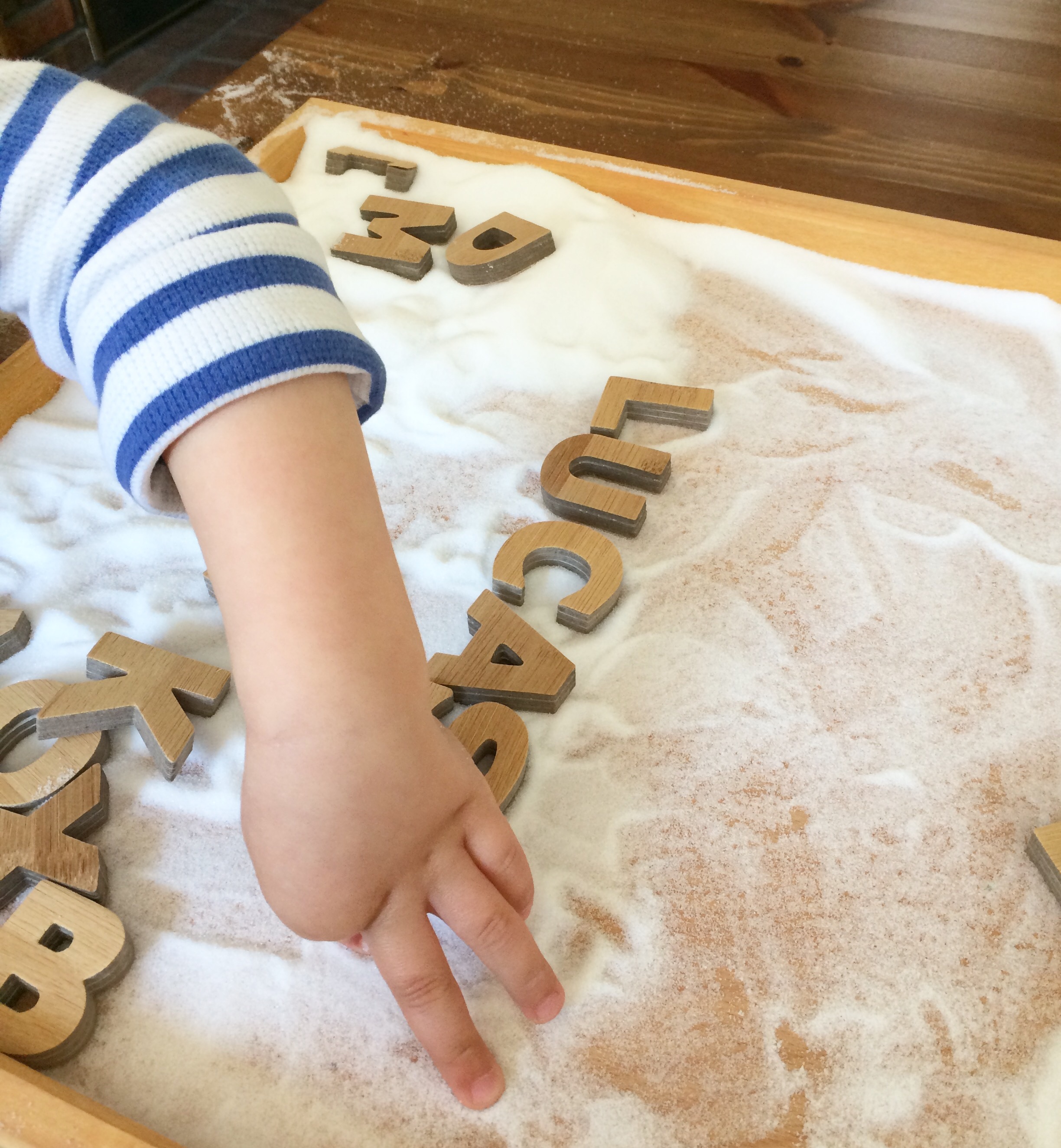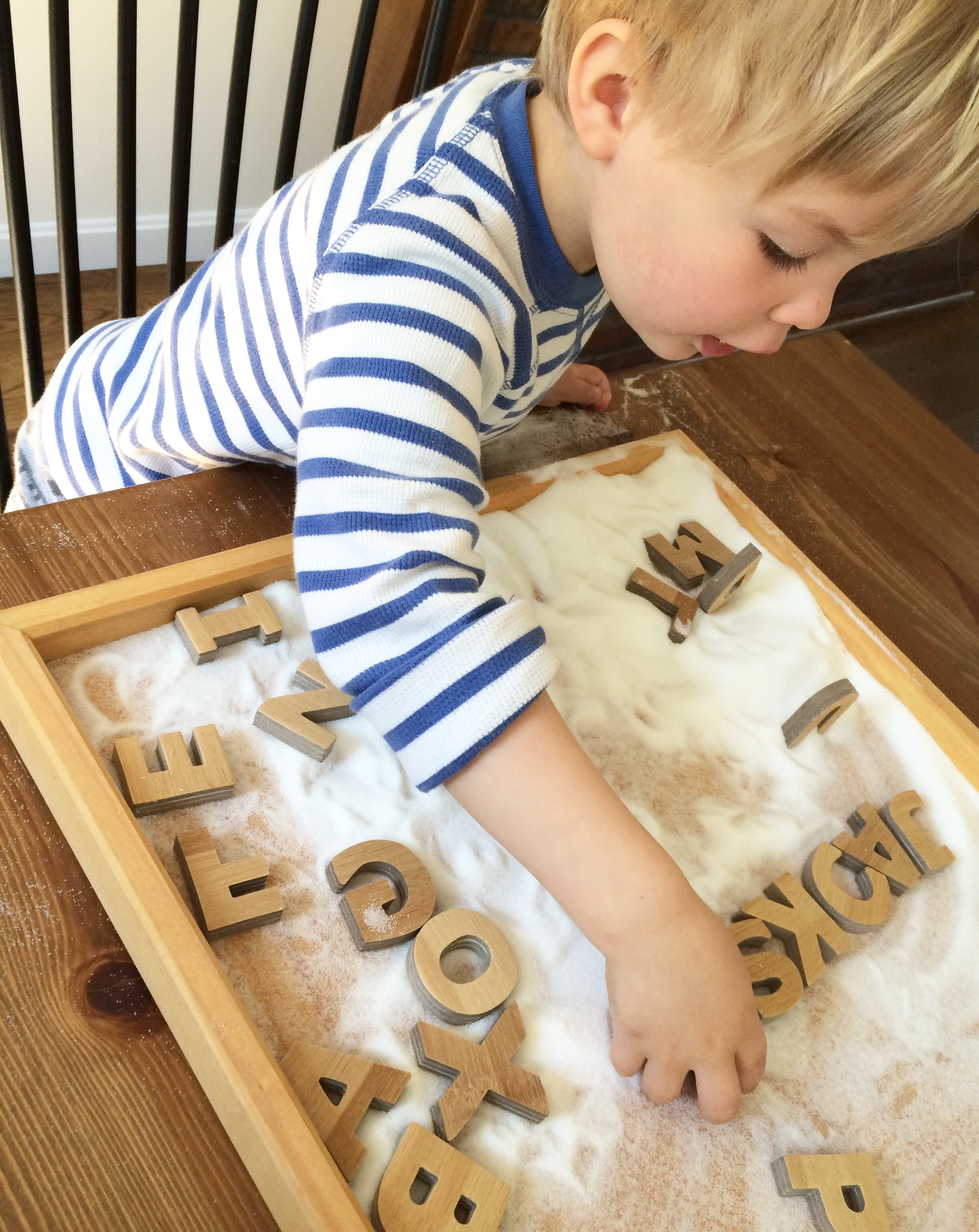 Pour salt into a tray (or baking sheet… anything with sides) and you’re off! We started with letters. Jackson LOVES spelling his name. Then Lucas’s name. Then Mama. (I’m trying so hard to hold onto this. I’m not ready for m-o-m.)