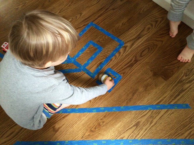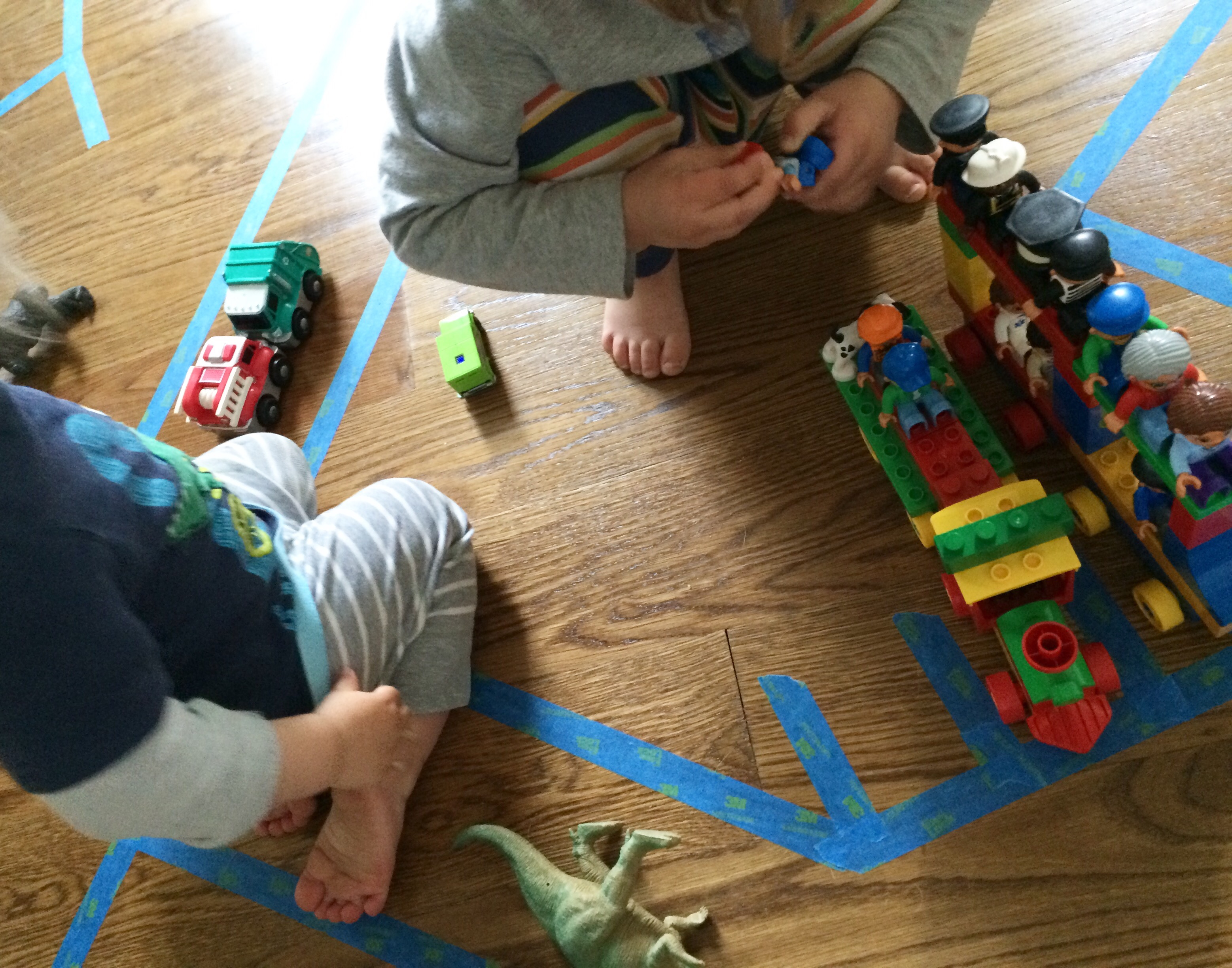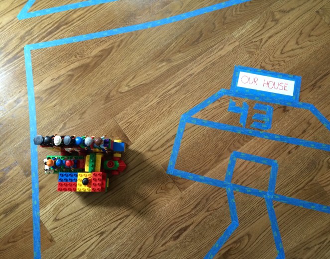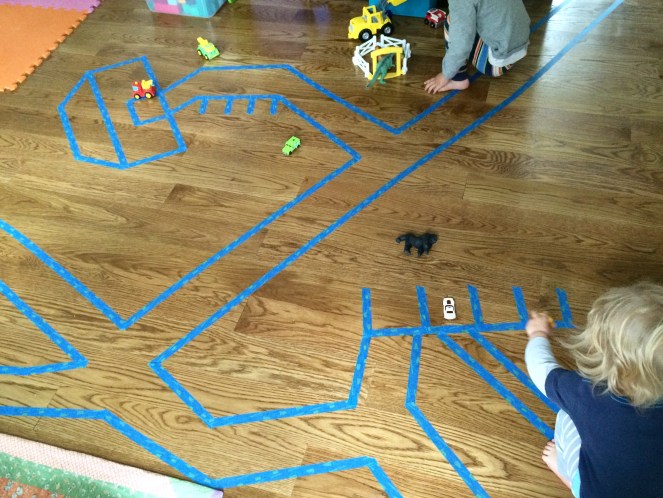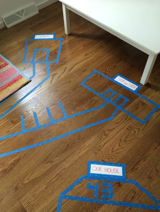 Tape town was big enough to give them their own space, but with opportunities for developmentally-appropriate social interactions and learning based on familiar scenarios. They went on hikes, parked at Stop and Shop and bought groceries, drove to Lowes for paint, returned books in the drop box at the library, and came home to play. Jackson and I talked about our address, directions, and landmarks. They navigated a few minor traffic jams and stolen parking spots, with only one major HE DESTROYED MY DOUBLE DECKER BUS meltdown. Win.