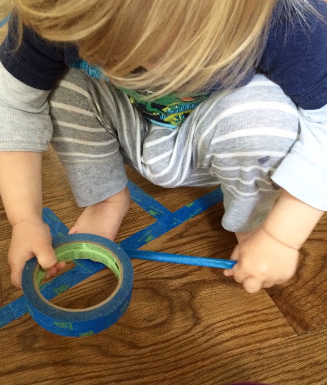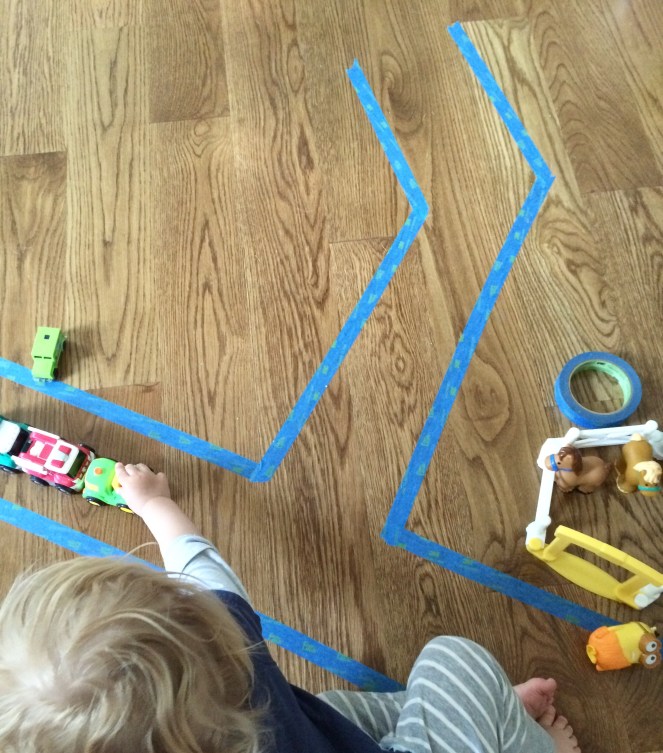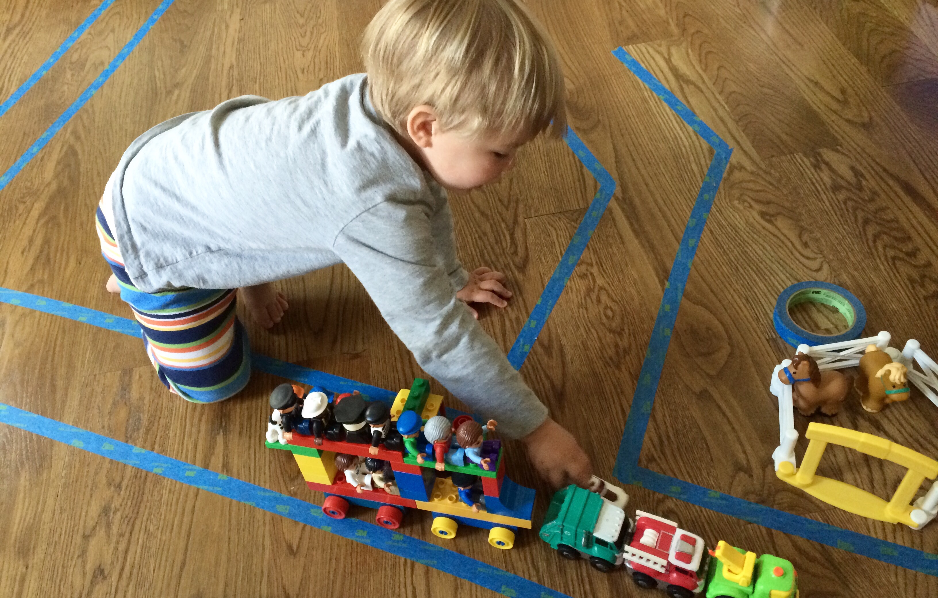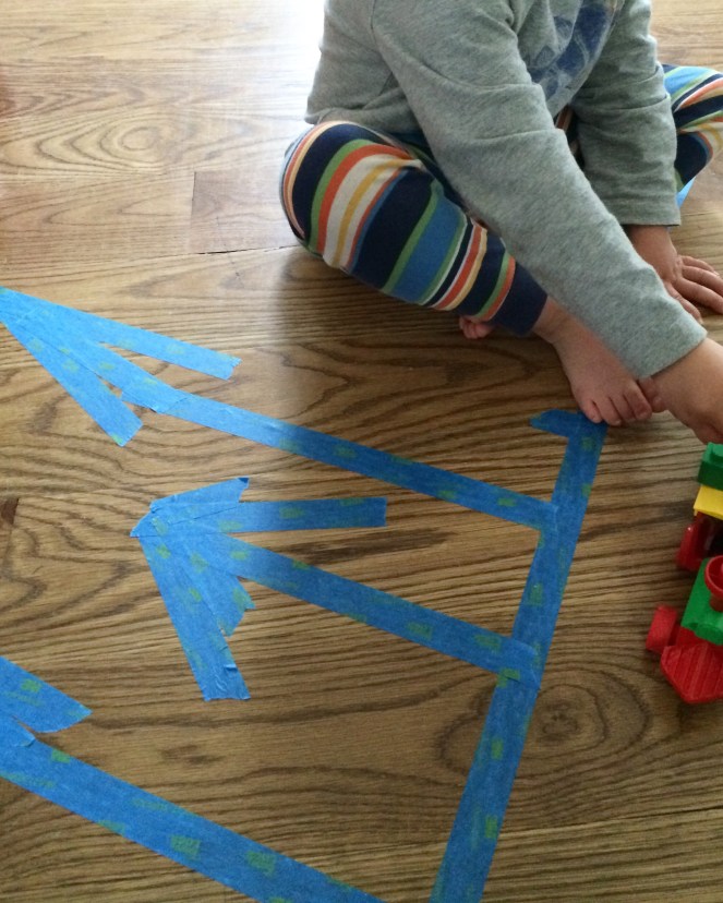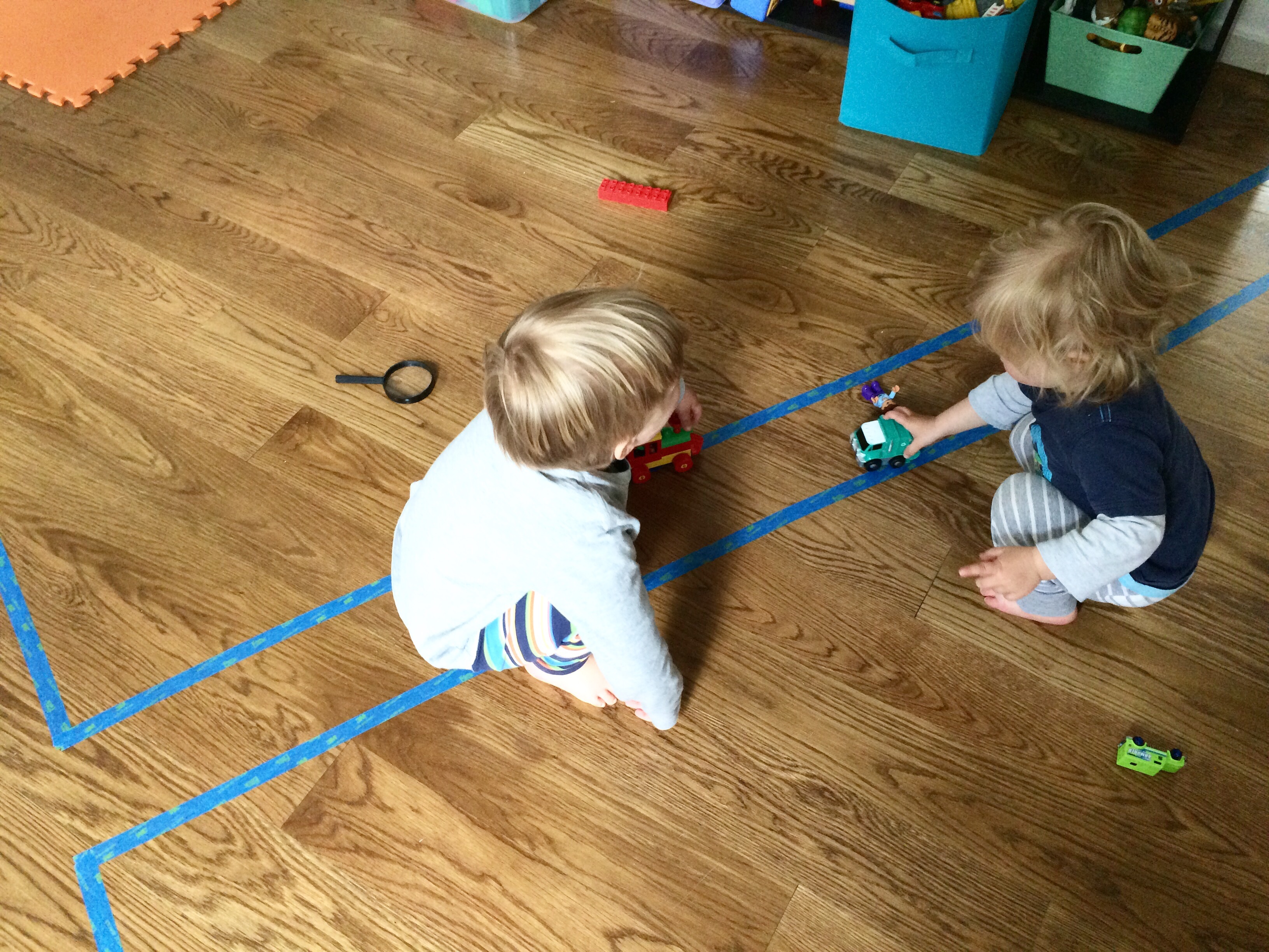 Tape town was big enough to give them their own space, but with opportunities for developmentally-appropriate social interactions and learning based on familiar scenarios. They went on hikes, parked at Stop and Shop and bought groceries, drove to Lowes for paint, returned books in the drop box at the library, and came home to play. Jackson and I talked about our address, directions, and landmarks. They navigated a few minor traffic jams and stolen parking spots, with only one major HE DESTROYED MY DOUBLE DECKER BUS meltdown. Win.