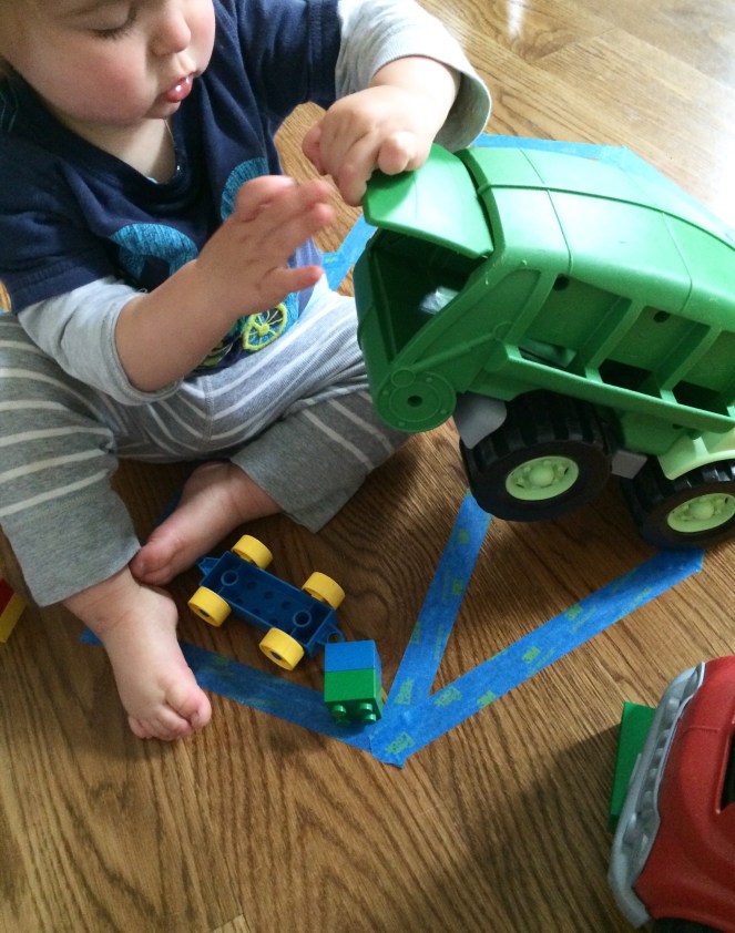 I added labels to reinforce letter identification and word recognition. Today is trash/recycling day in our town, and after the kids watched the trucks go by, Lucas grabbed his favorite truck and shoved some Legos in the back.