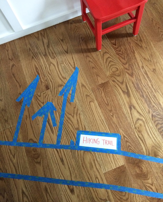 Then a library. Lowes. (Like I said… renovation.) Our house. The horses we drive by down the street. The forest where we take our hikes. The stump (the little piece of tape) he and Lucas love to jump off of on the trail.