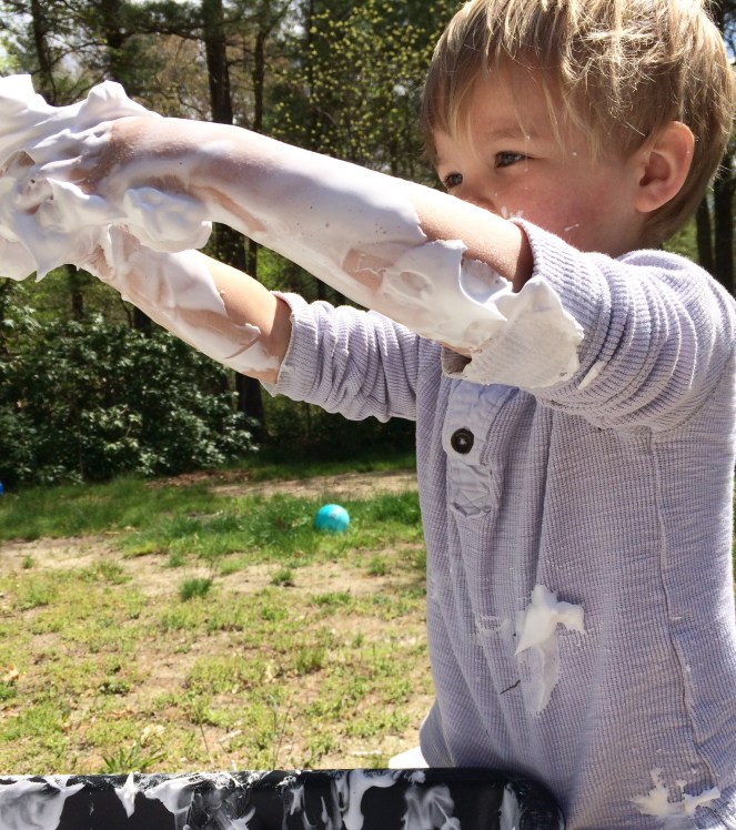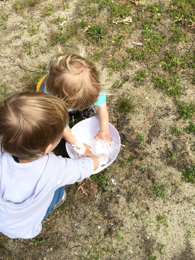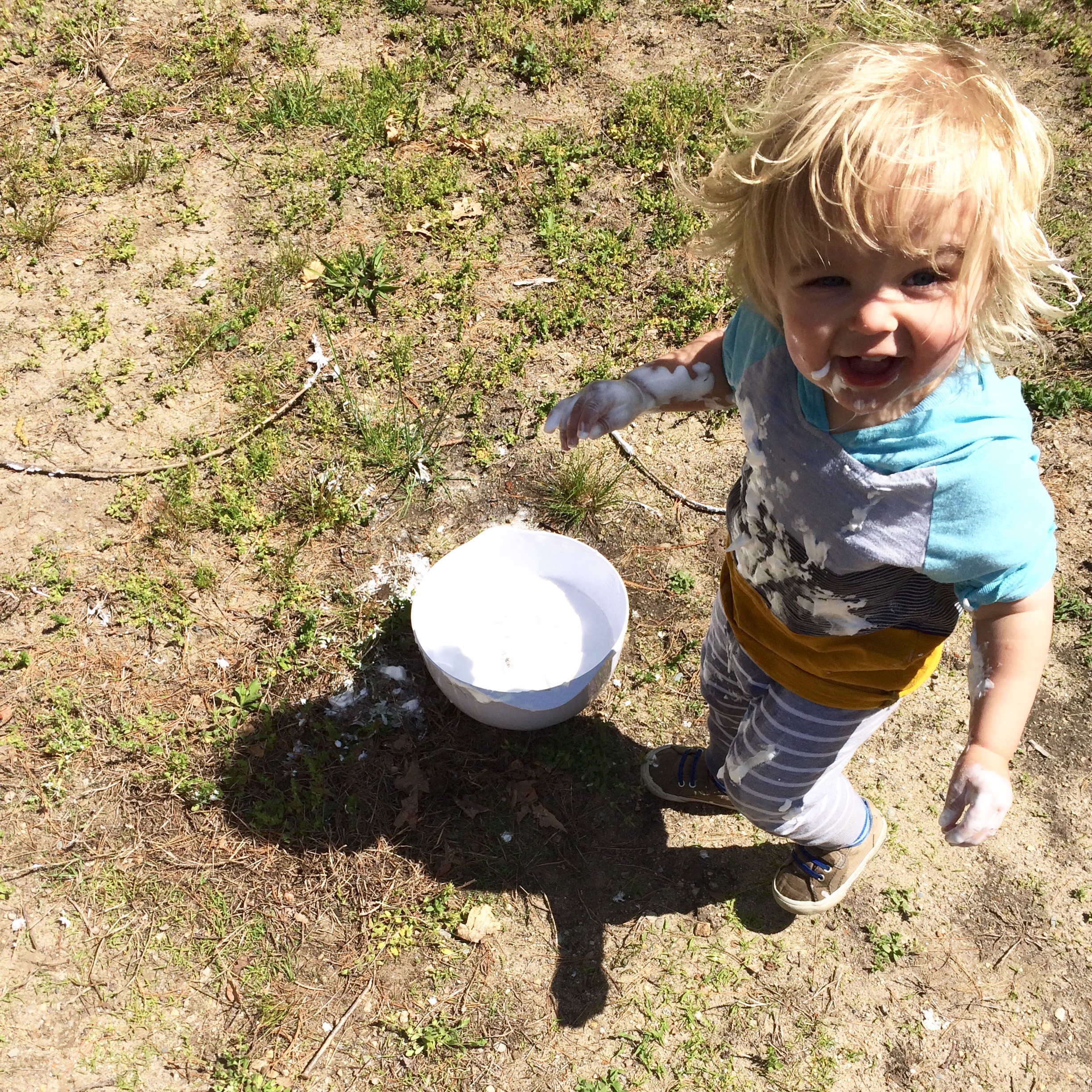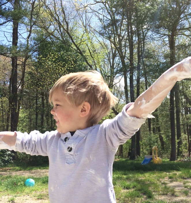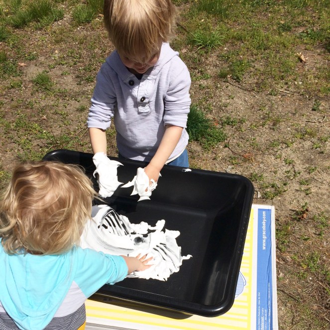 Between our recent teething kick with Lucas and the fact that somebody must have told Jackson he should really start acting like a stereotypical 3.5-year-old, we’ve been having a lot of THOSE DAYS lately. One of the only things I’ve found to bring my boys joy on those days is a crazy sensory experience like this. And being outside. That always makes all of us feel better.