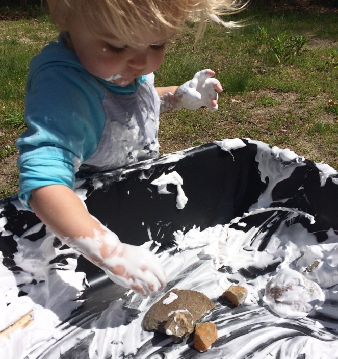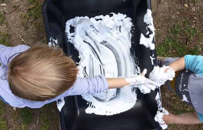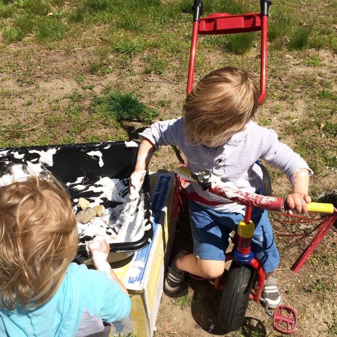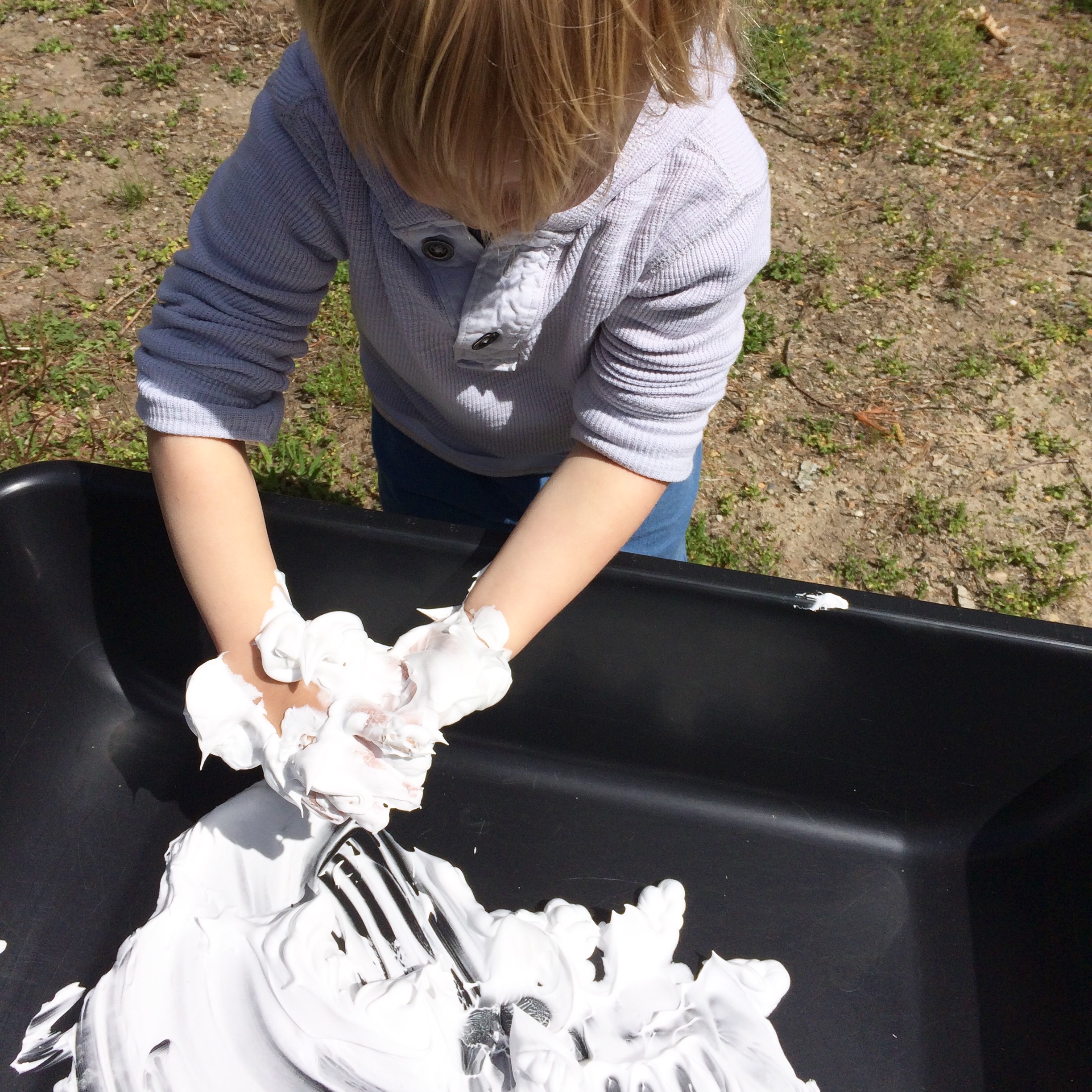 My boys engaged with this activity in very different ways. Jackson stuck his hands right in, played hard for about 10 minutes, then incorporated his bike. He drove in loops, stopping to “fill’er up” with shaving cream fuel. Then he painted the handle bars and bell with the cream. It still dinged!