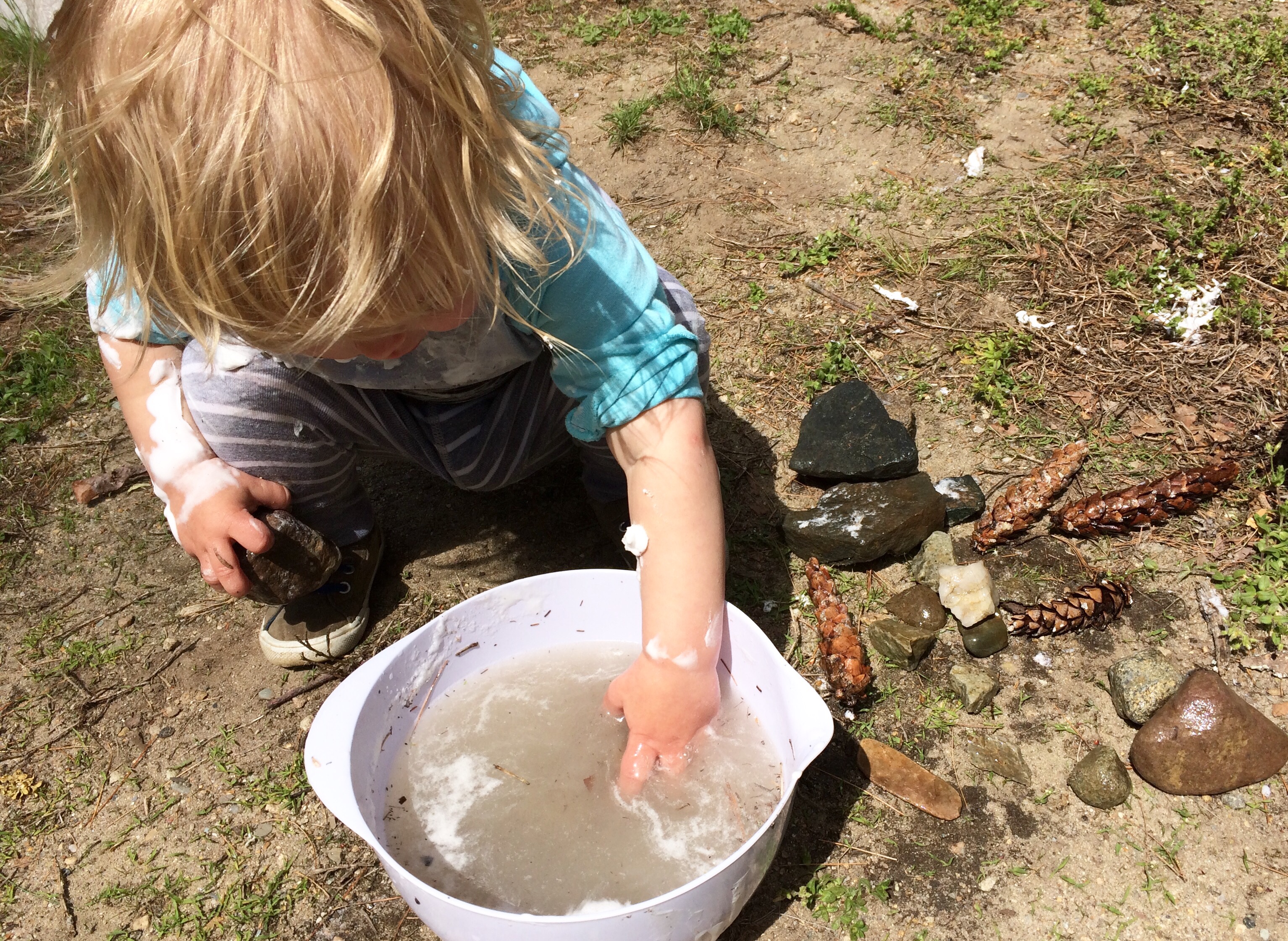 Lucas was all in… until he wasn’t. When he wanted to clean his hands, I grabbed a big bowl of water and it was a hit. He actually ended up spending the majority of his time transferring rocks (his favorite) from our yard, to the shaving cream, to the water bowl. We made stick roads and rock walls. We sorted rocks and sticks and pinecones into piles. We made a recipe for stone soup and wrote our names with our fingers and sticks.