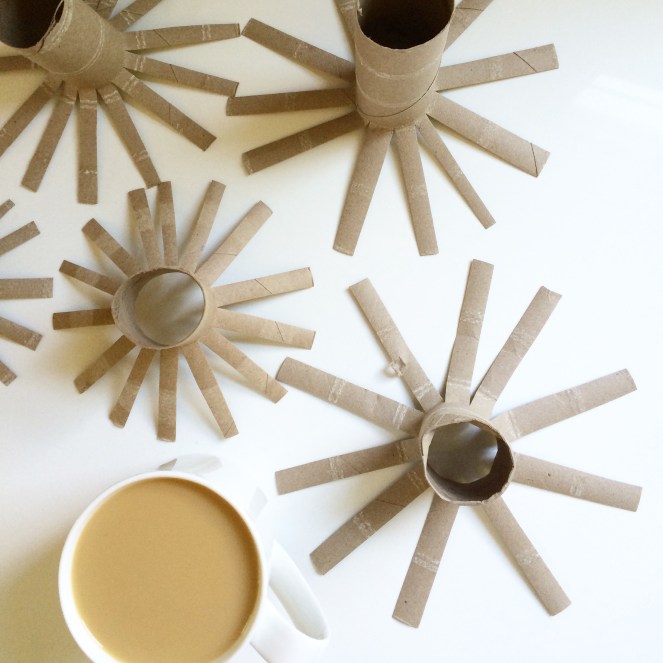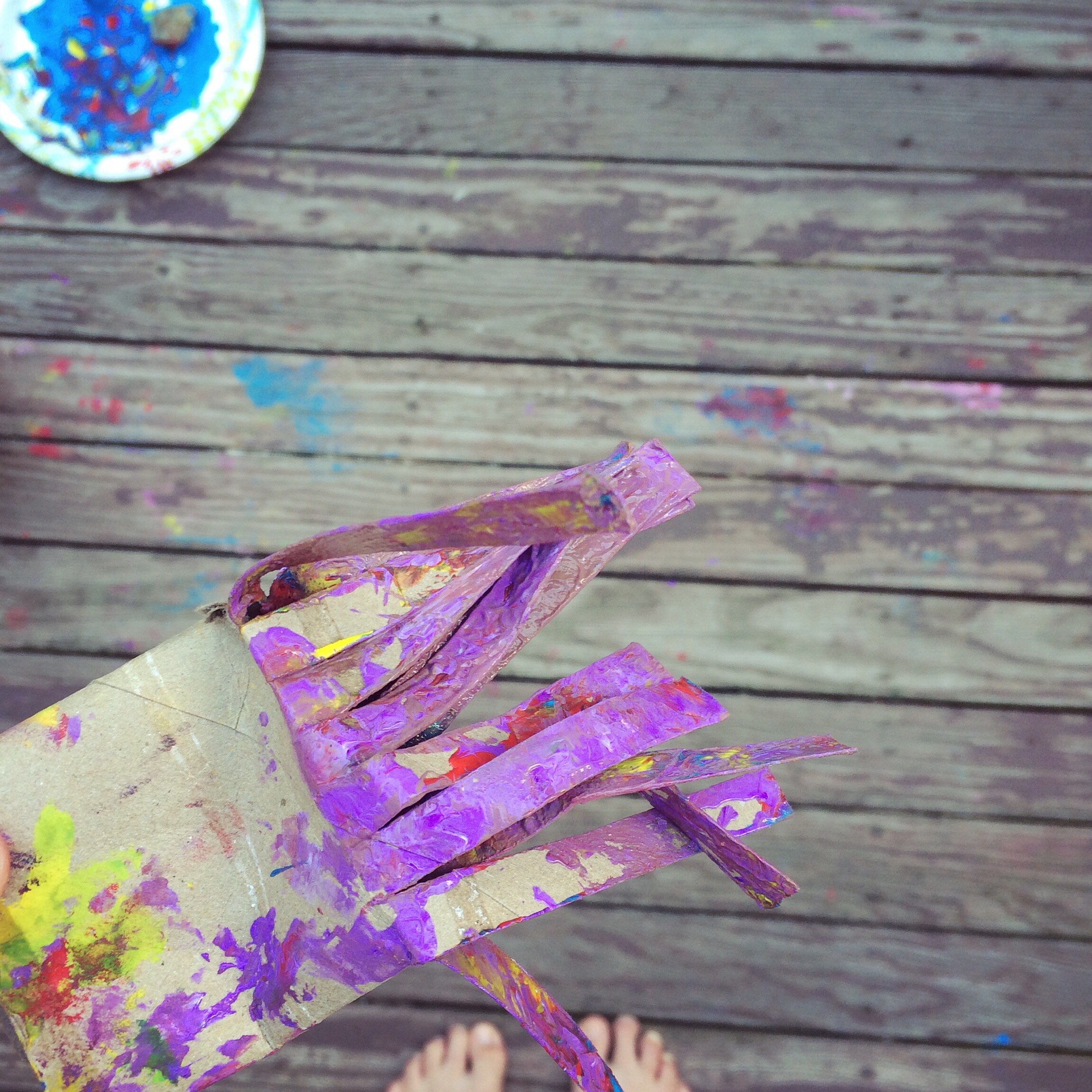 Prep was simple: cut slits (of the same length) around one side of a cardboard tube and bend back. I used paper towel and toilet paper tubes to vary the size of the “fireworks”.