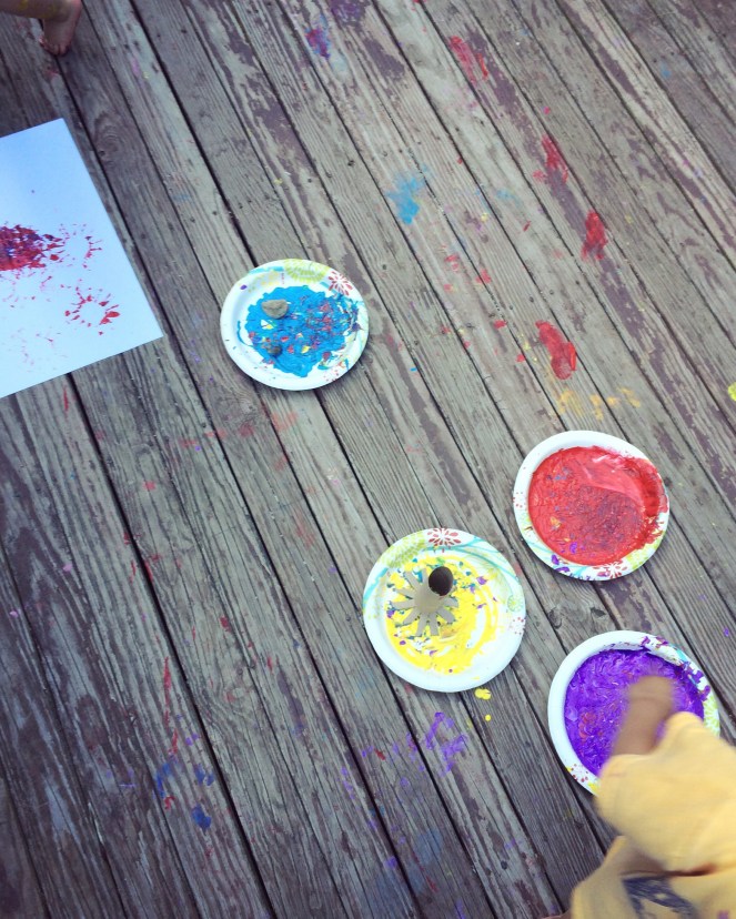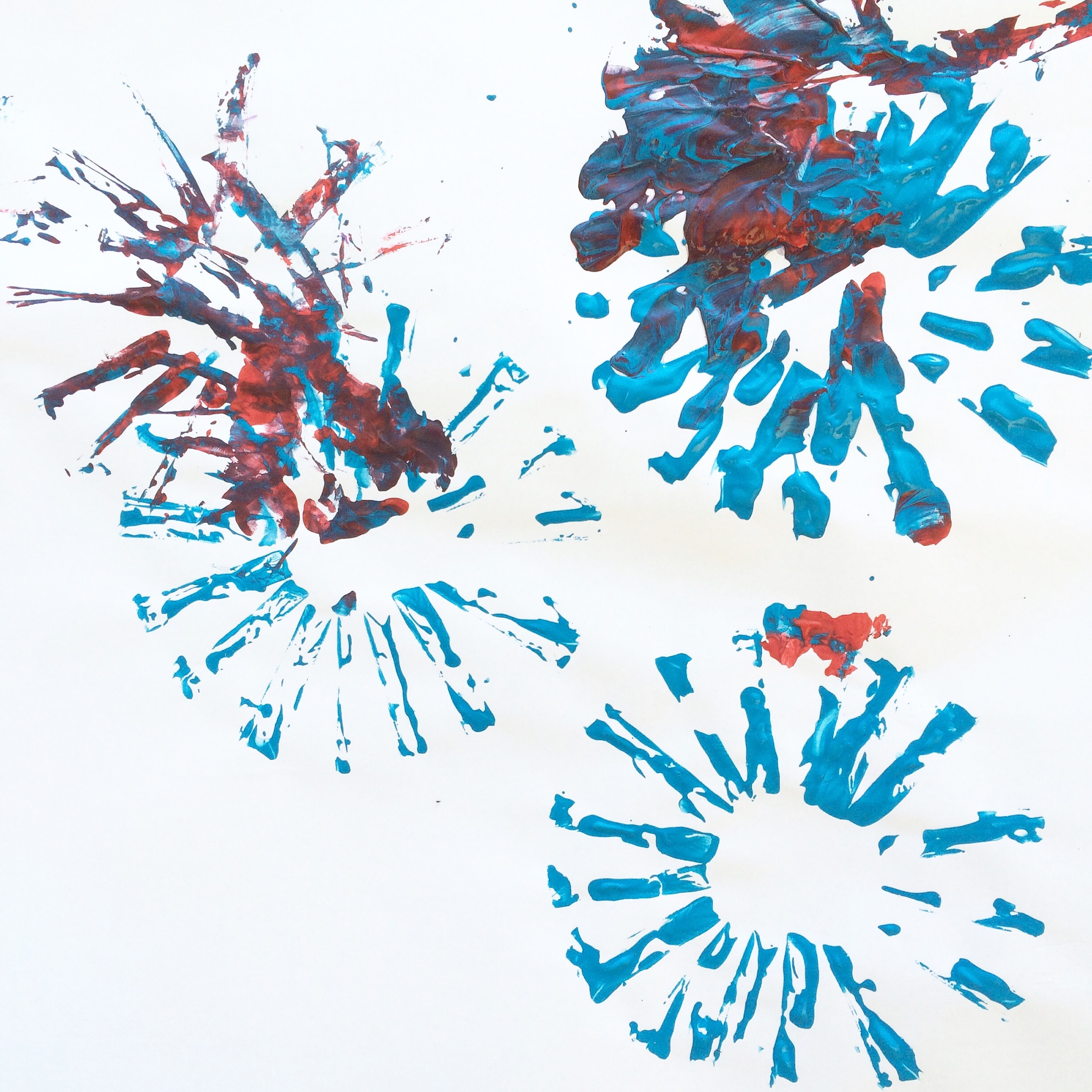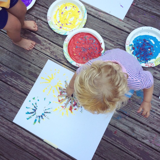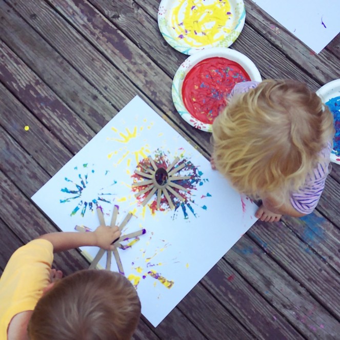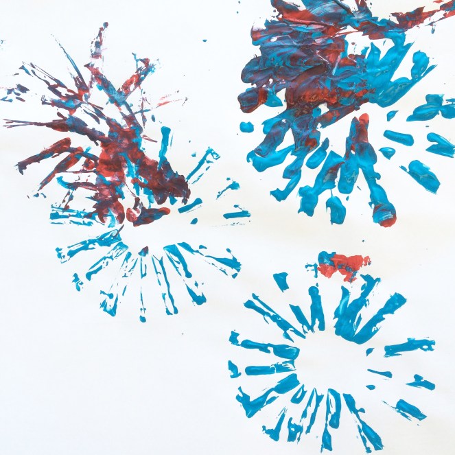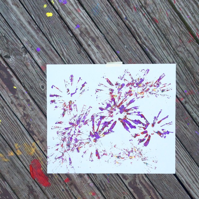 A tip for those starting this one: Don’t use too much paint! I tried to push it a bit so I wouldn’t have to keep refilling the plates, but it made the cardboard mushy and they soon lost their shape. The kids didn’t care, but they didn’t look like fireworks for long! I ended up ripping some of them in half and that worked well to finish the project.