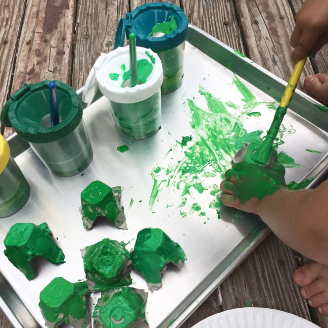 First, we painted egg carton pieces… love upcycled materials! (I got this fabulous idea on Pinterest from Emma Owl.)