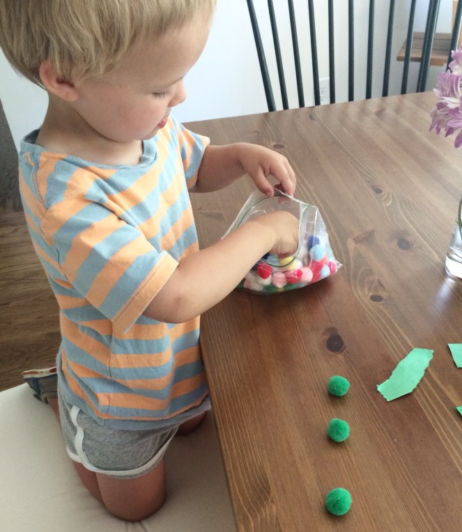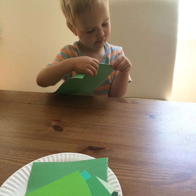 I wanted the boys to get some practice tearing pieces of paper, a great fine motor and hand-strengthening activity. I provided several shades of green, which also gave them different textures and paper strengths to manipulate. (Ironically, they tear pages in our library books much easier than they tore these! Good thing we have a resident book doctor.)