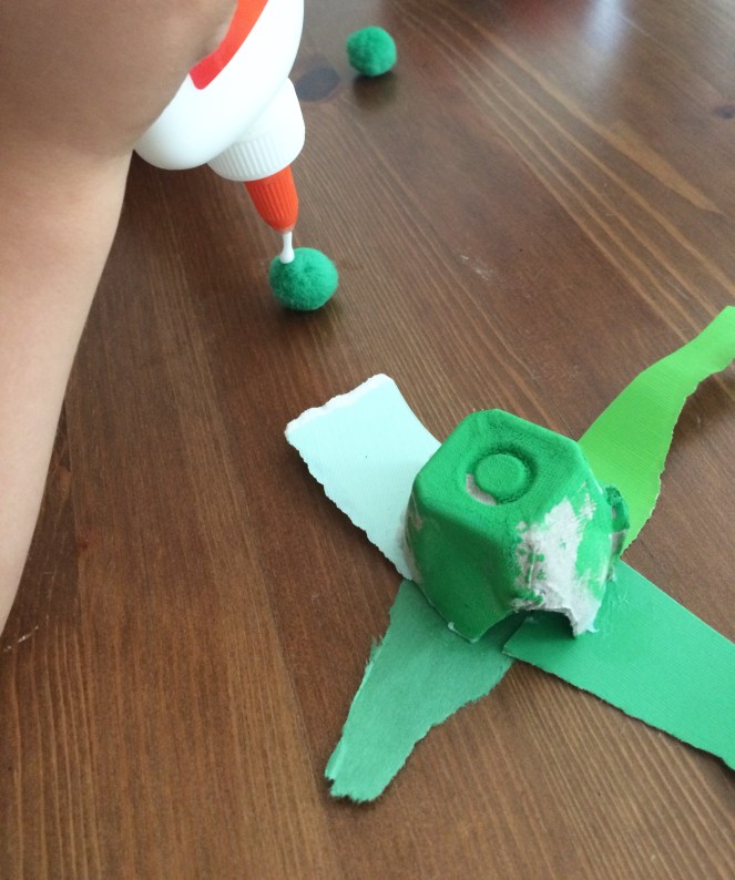 In this case, Jackson started out using way too much glue. He got frustrated when the flippers fell off as he pushed the shell around. But he was determined. He quickly began adding the glue (“just a dab’ll do ya mama!”) to one side of the flipper, the side that would touch the shell. He gently turned the shell to add all 4 flippers. He did it.