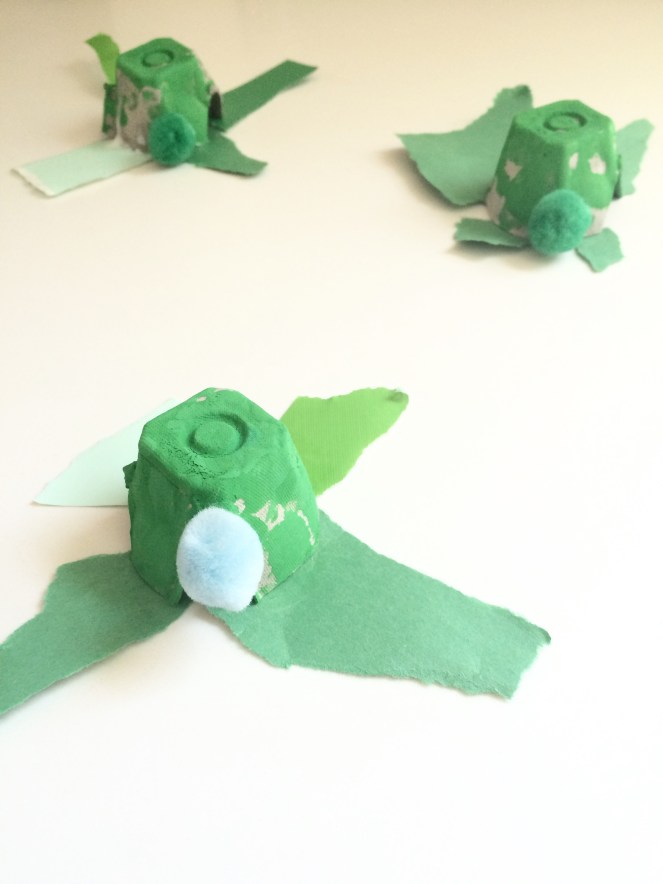 Once we added a pom pom head to each, we let them dry and then added them to the ocean. Some are even crawling out to lay their eggs.