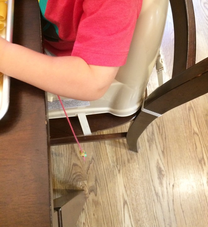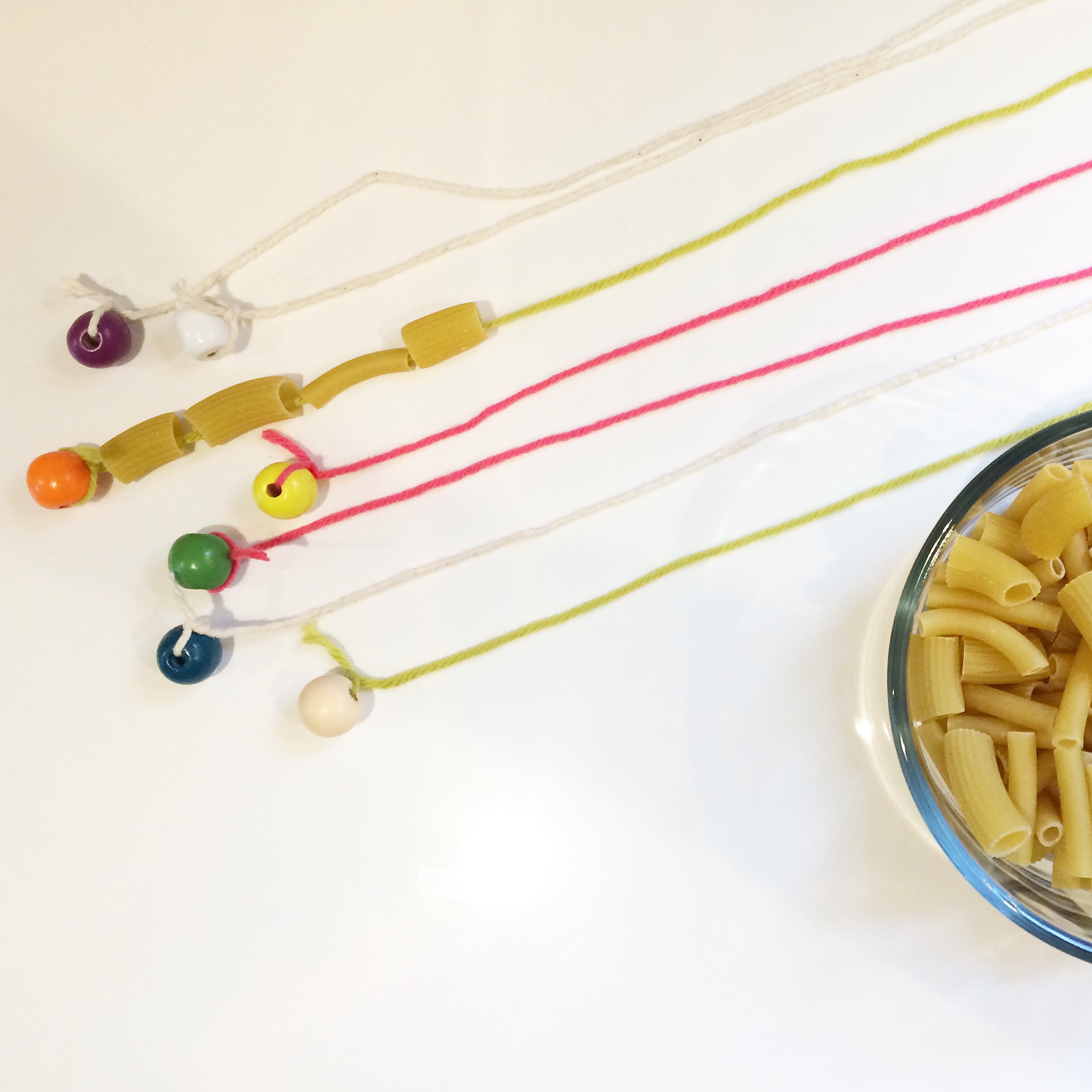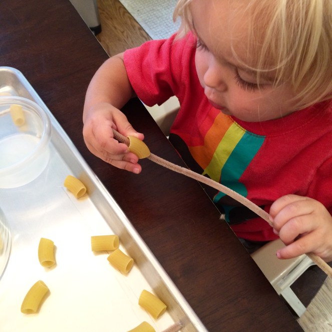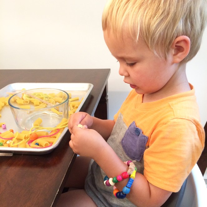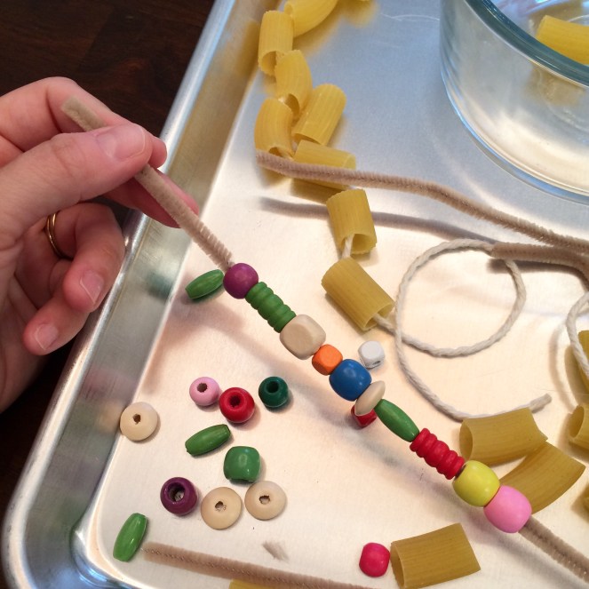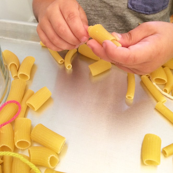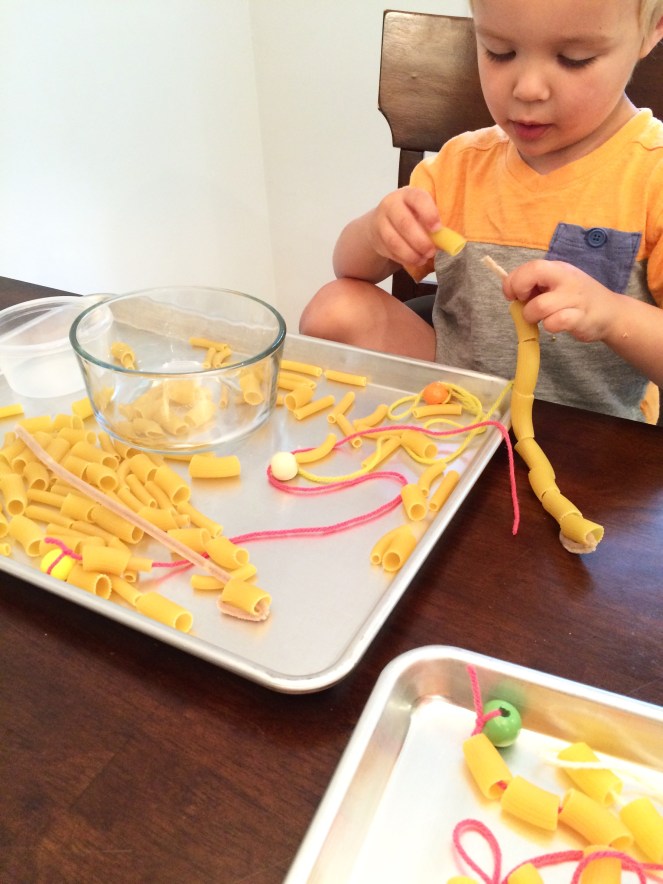 I put together a quick invitation to play for the boys this morning, stringing pasta onto yarn.