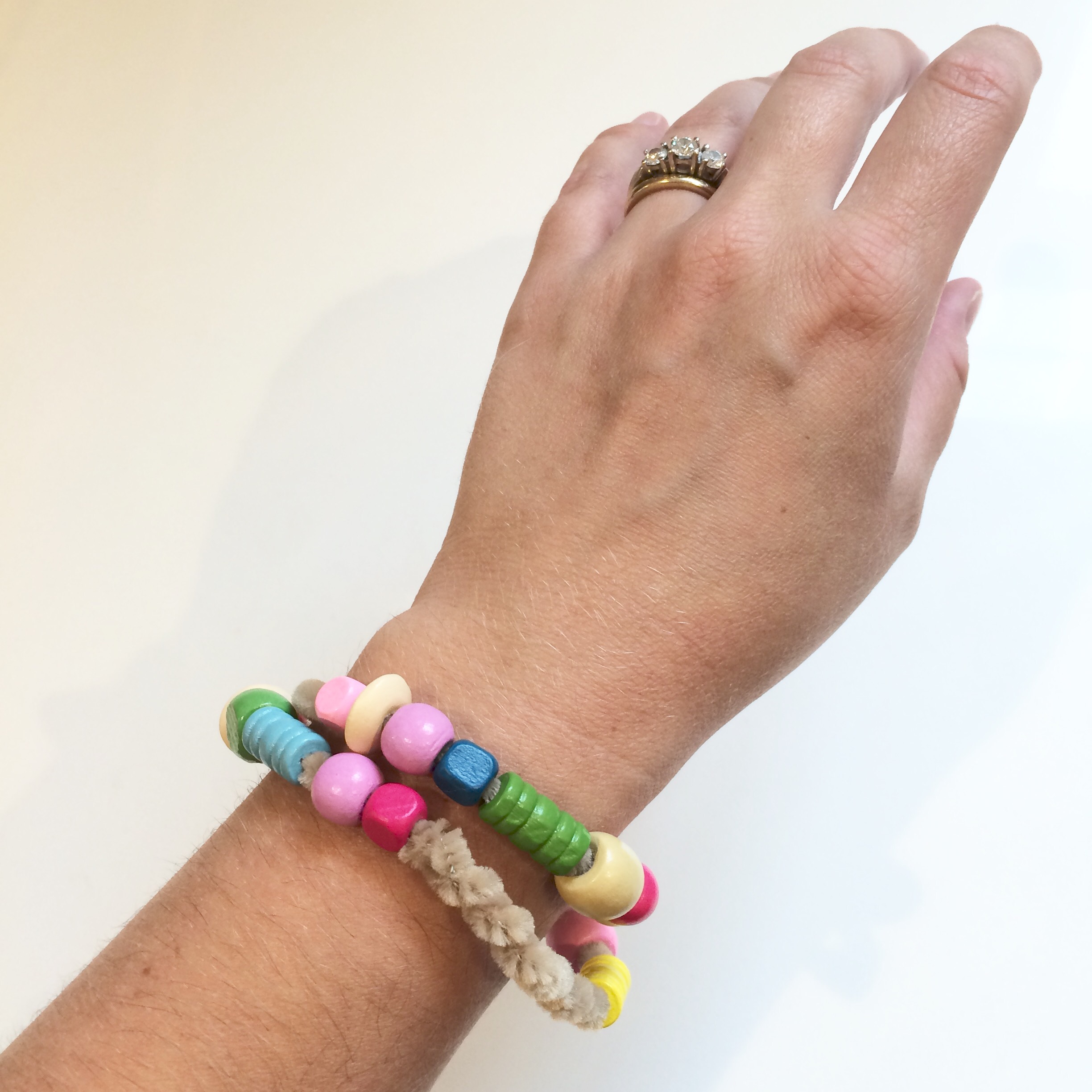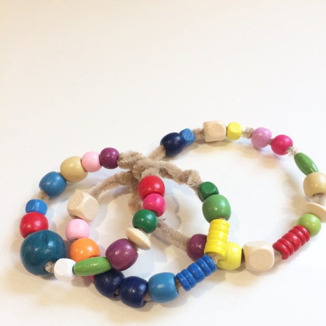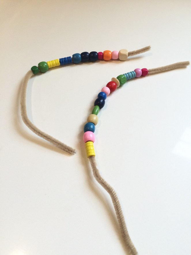 They were having so much fun with the pasta, and manipulating the pipe cleaners, that I added one more item. I am a sucker for wooden beads, and today I discovered my boys are, too. We talked about the different colors and shapes, about patterns and textures, and about the process. They made bracelets for themselves, for me, and even one for daddy when he gets home.