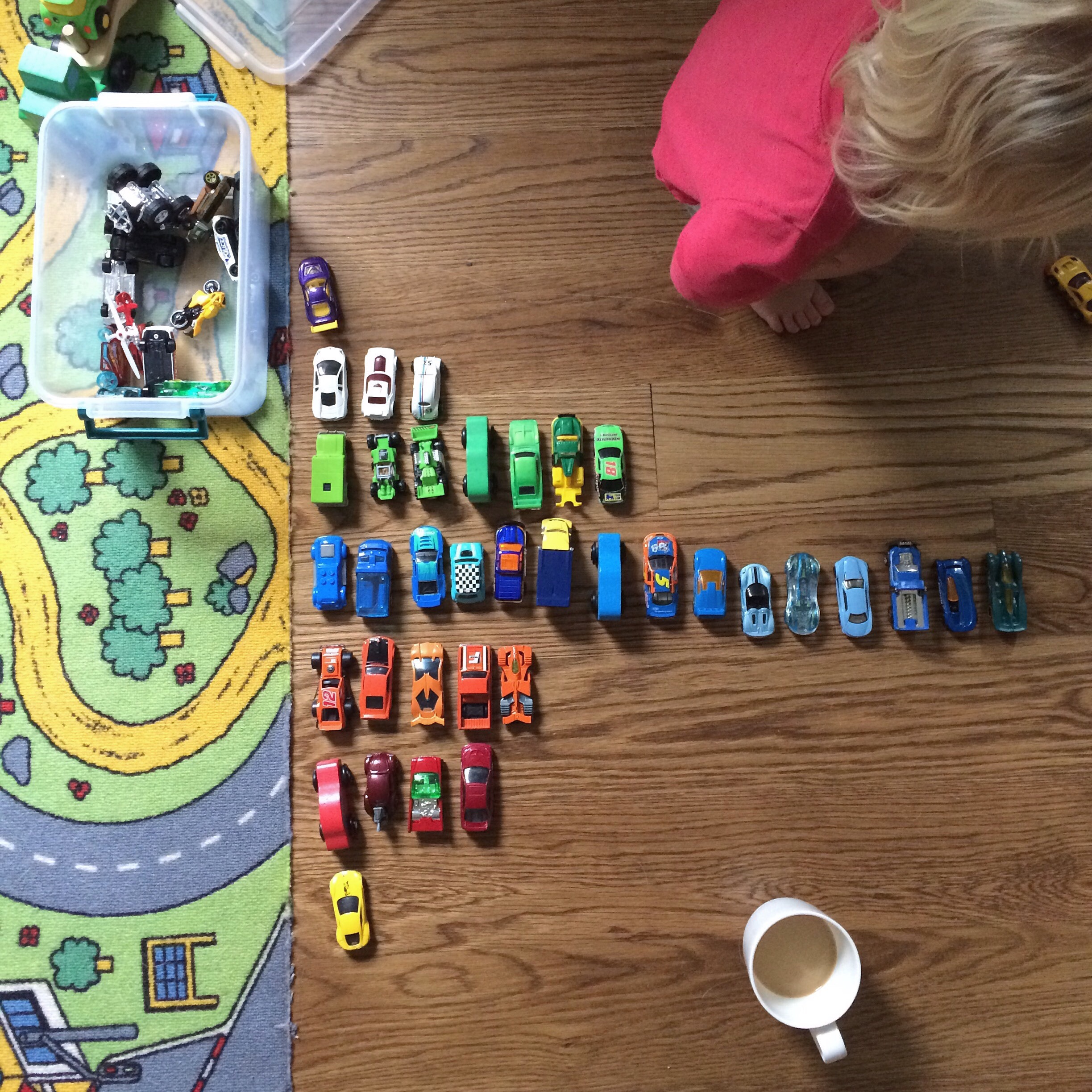 The little guy and I made our very own hotwheels bar graph. This simple activity took no prep or money and gave us some awesome teaching moments. Sorting, color identification, making a line, counting, the concept of more/less… so much good stuff.