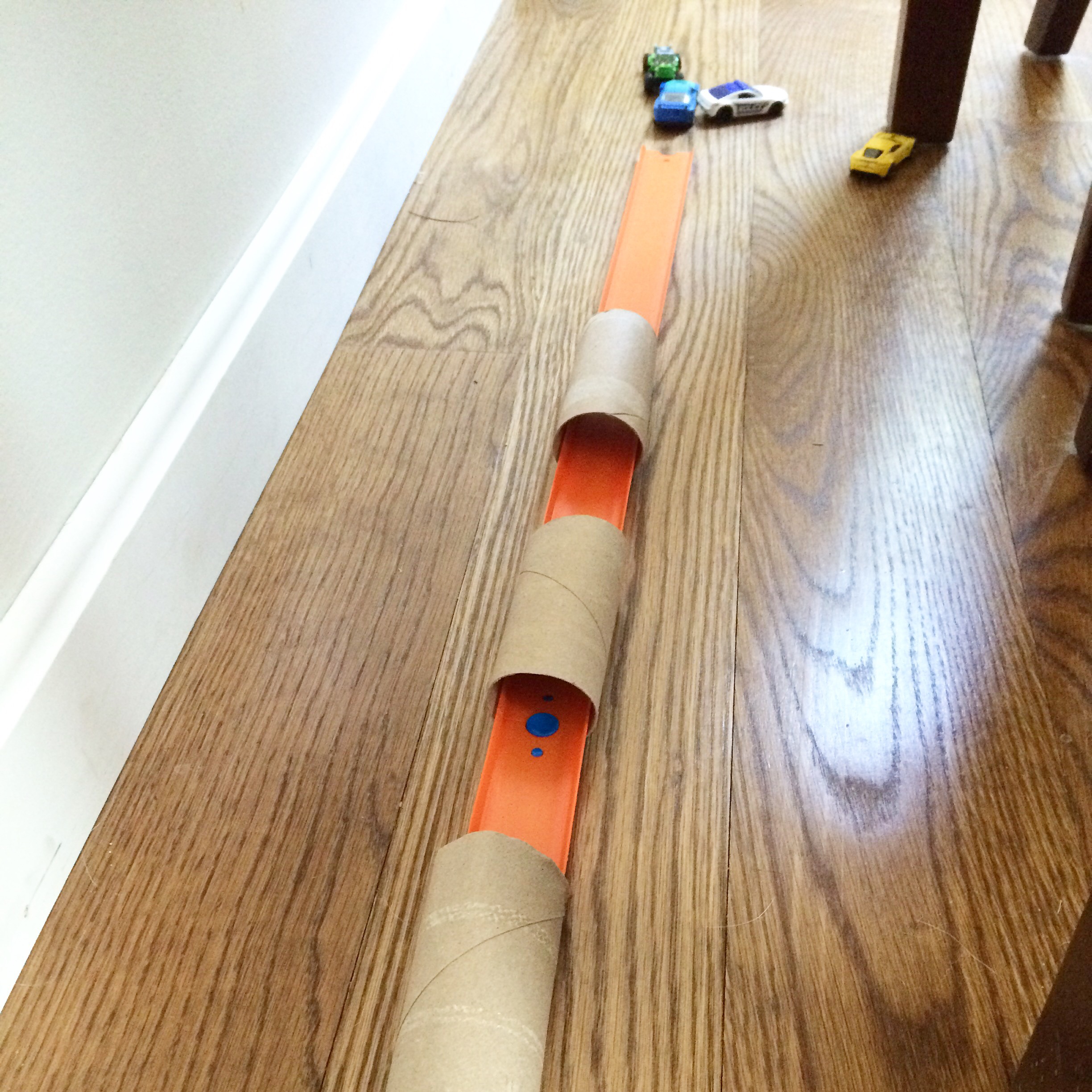 We’ve had tracks for a while, but this time I wanted to add something different. We taped one end of each track to a kitchen chair and bam. So much fun. The boys loved trying each car and truck. Would it go fast or slow? Would it stay on the track or shoot off the end? Would it knock the other car off the track? It was like one giant science experiment.
