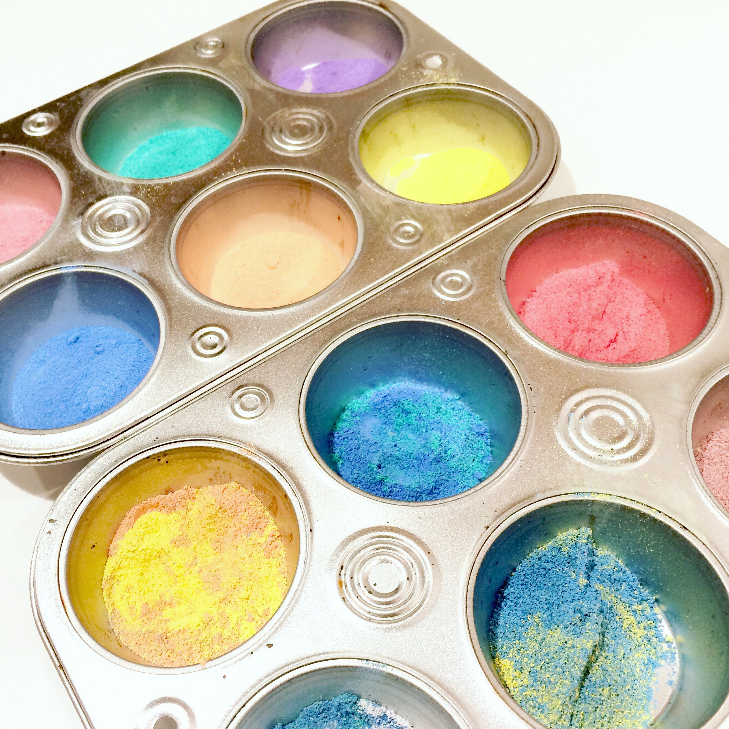 I LOVE the colors of our chalk so I decided to use that instead of food coloring or liquid watercolors. I grated chalk and put it in muffin tins. You could stop there and just add water, but I wanted to add another sensory and science element to this, so I scooped a heaping tablespoon of baking soda into each. Then I topped off with water and froze them.