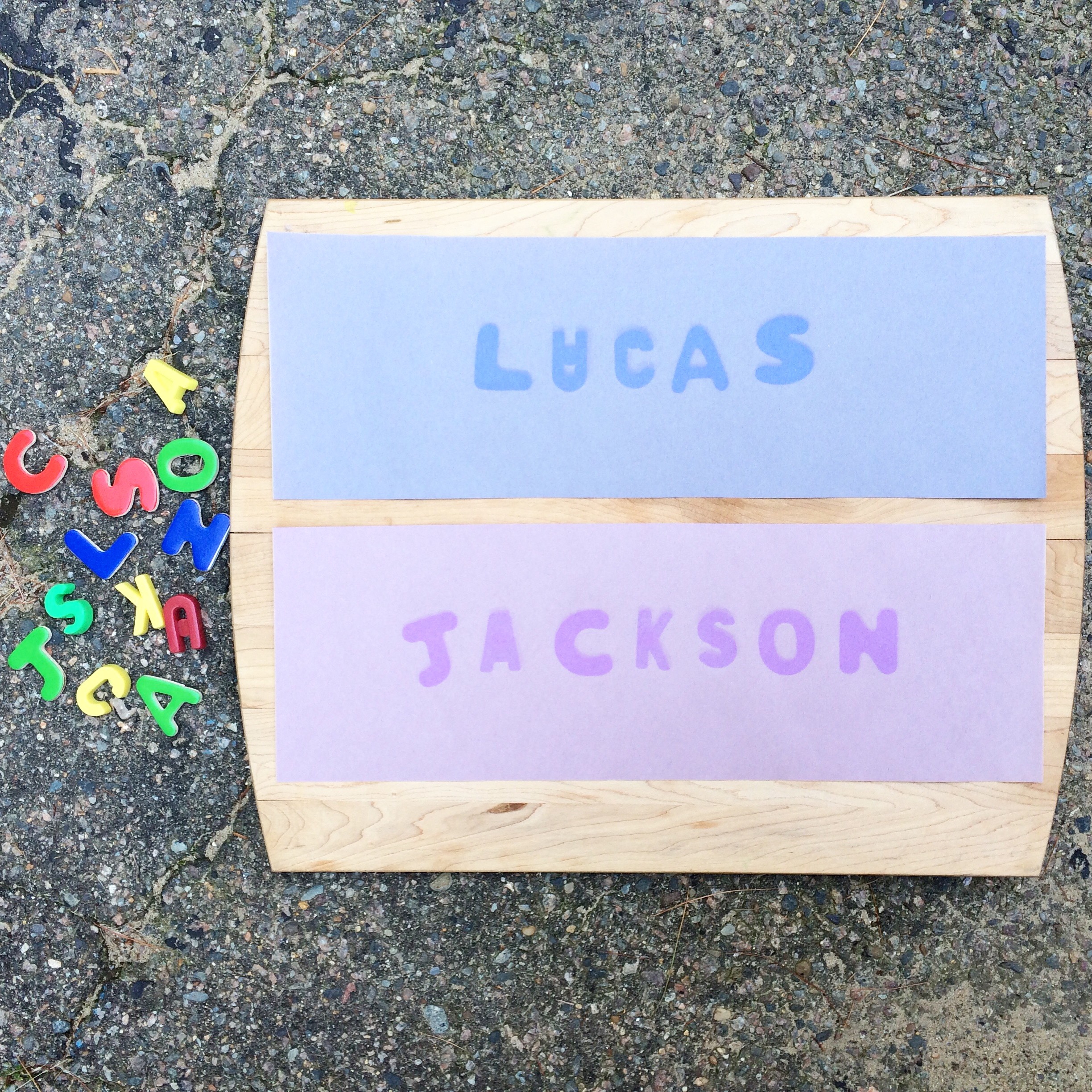 Just spell a name (or any word) on construction paper and leave it in the sun for a few hours. The kids LOVE taking the letters off. It’s like magic!